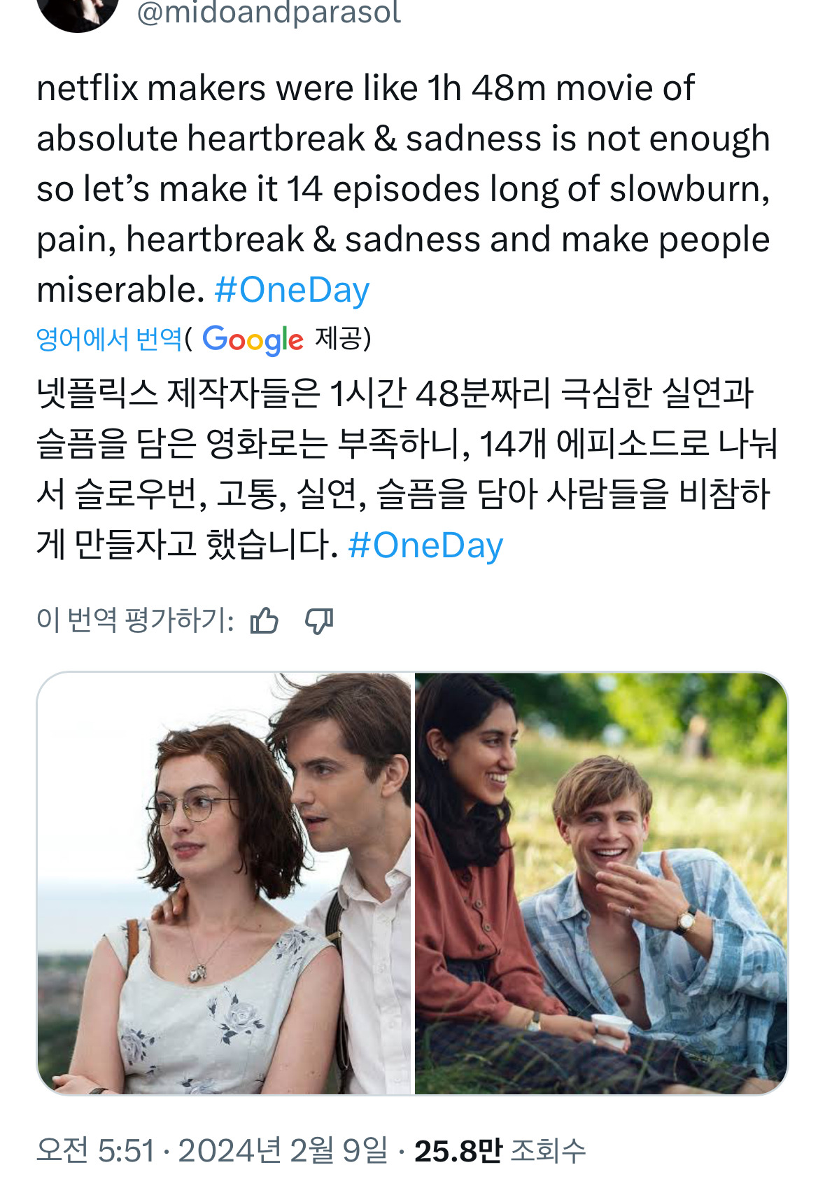 넷플릭스 드라마 <원 데이> 아직 2월밖에 안 됐지만 올해 최고의 드라마 중 하나로 꼽을게...🥹