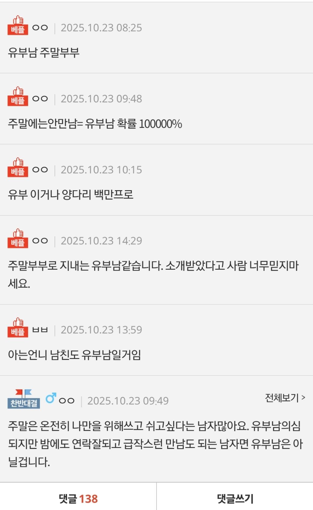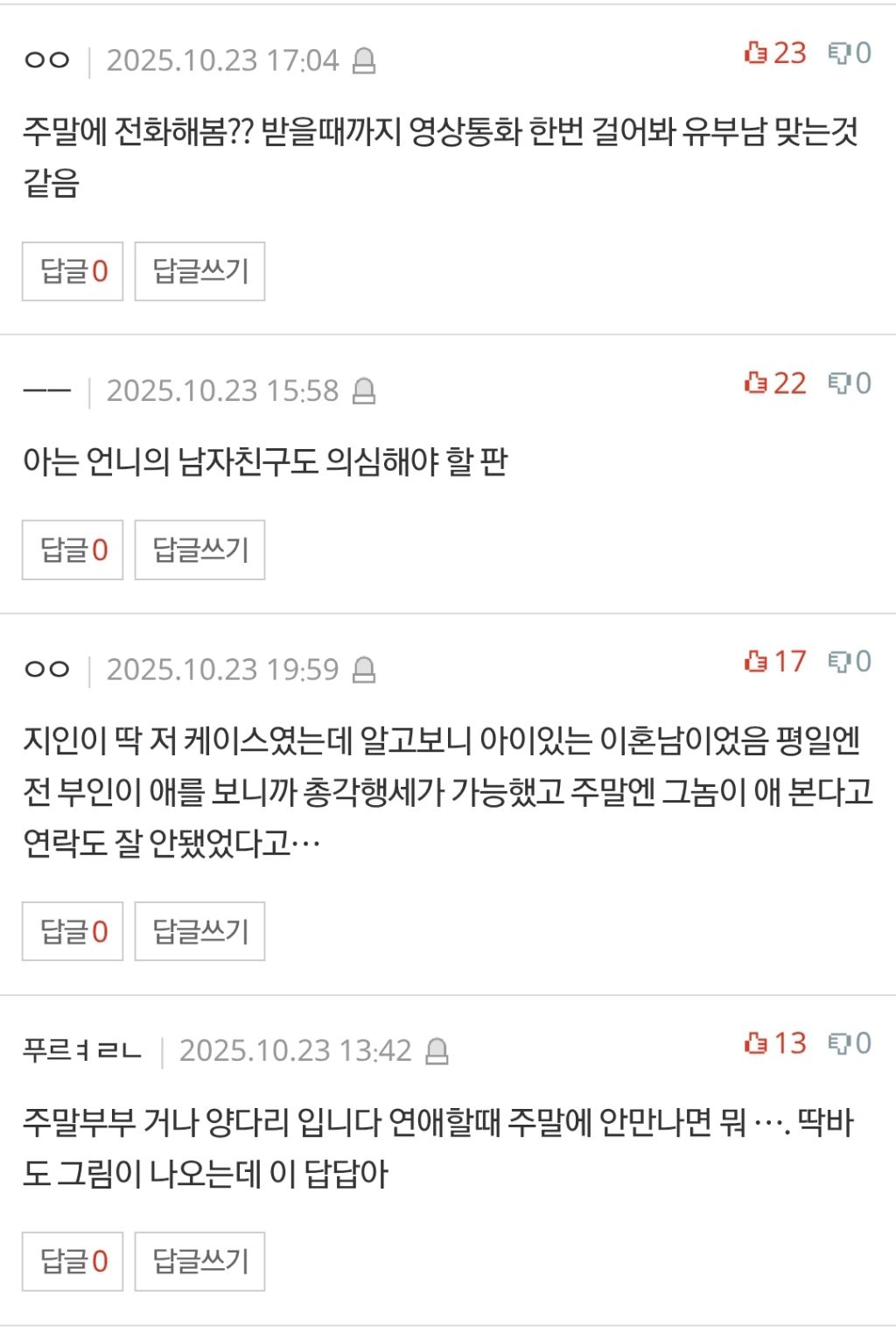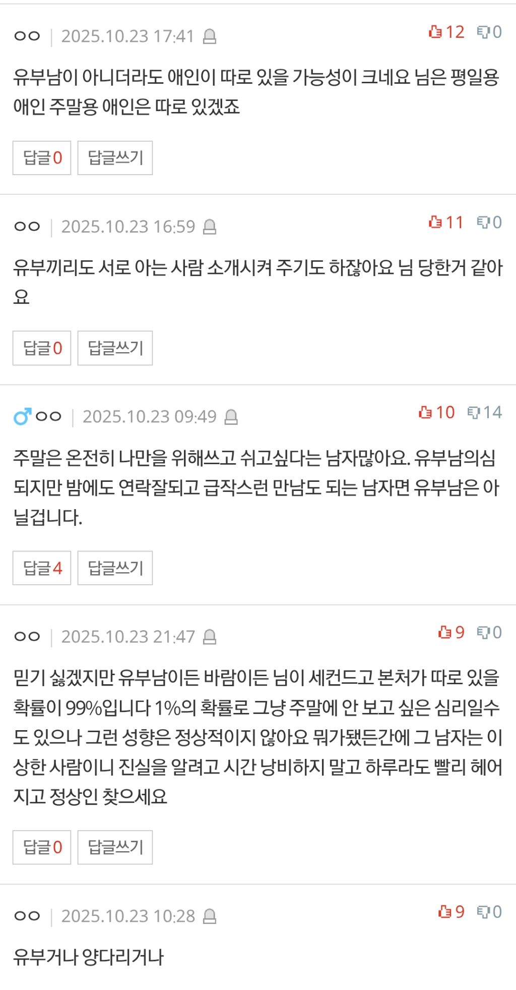 유부남한테 당해봤는데 평일주말할것없이 만났고 남친의 친구들 10명넘게만났는데 다 한통속이었음 죽일놈들 ㅡㅡ