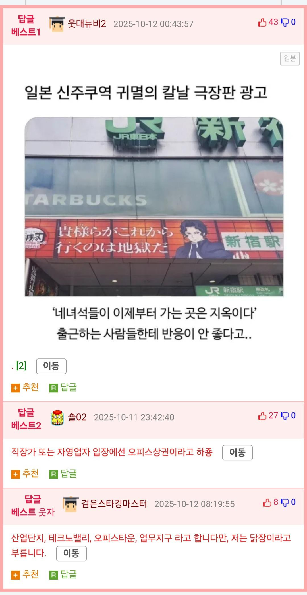 [스크랩] [흥미돋]회사 많이 모여있는 곳을 뭐라하지? 작성자flflf|작성시간25.10.24|조회수29,124 목록 댓글 11 글자크기 작게가 글자크기 크게가 다음검색 스크랩 원문 : 도탁스 (DOTAX) 현재 게시글 추가 기능 열기 북마크 공유하기 신고 센터로 신고 댓글 댓글 11 댓글쓰기 답글쓰기 댓글 리스트 작성자로또 1등이 되었다 | 작성시간 25.10.24 산업단지가 지옥보고 기억이안났네ㅋㅋ 작성자소환사 | 작성시간 25.10.24 무덤가지.................. 뭐긴 뭐냐 작성자롱스틱 | 작성시간 25.10.24 공동묘지..? 작성자도롱통통 | 작성시간 25.10.24 저 간판 직장인들 빡칠만도 ㅋㅋㅋㅋㅋㅋ 작성자어유무슨고양이가이렇게뚱뚱하고커요 | 작성시간 25.10.24 제목 보자마자 지옥? 하고 들어옴 댓글 전체보기