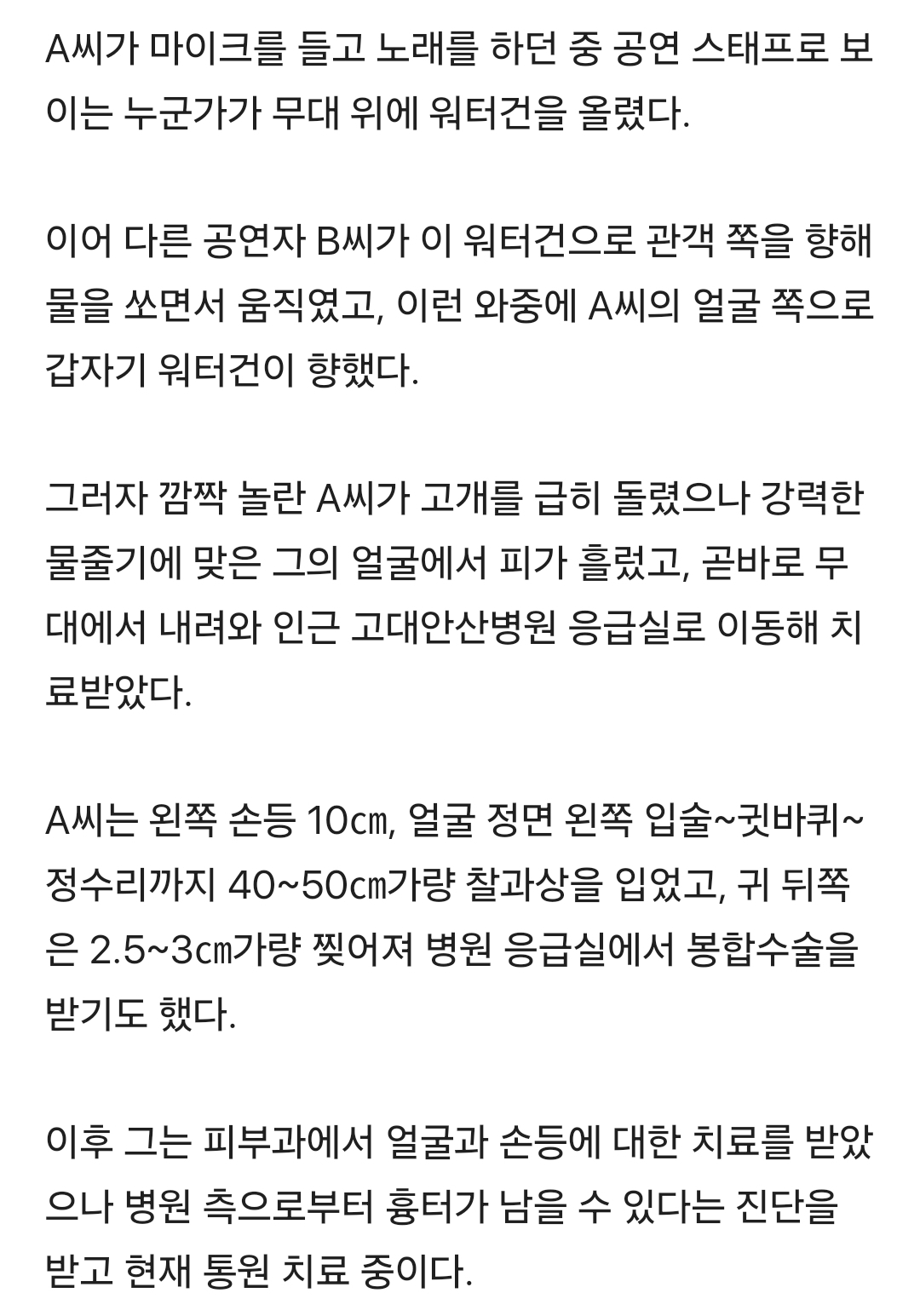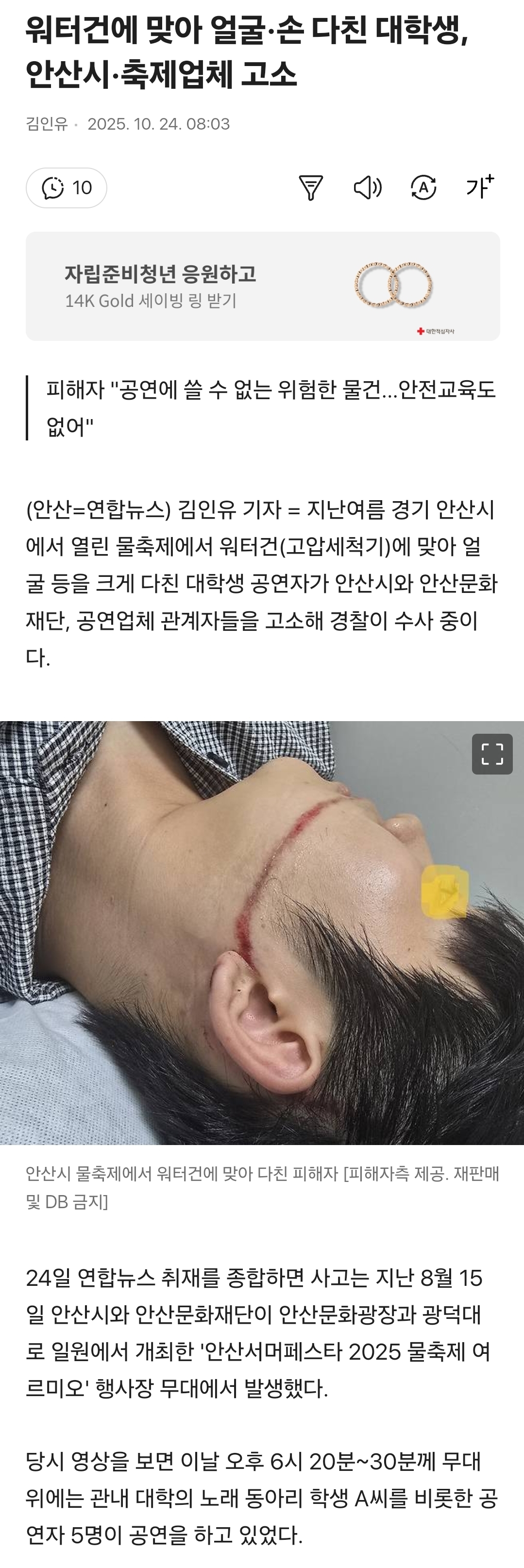 [여시뉴스데스크]워터건에 맞아 얼굴·손 다친 대학생, 안산시·축제업체 고소 작성자멍청비용아니길제발요|작성시간25.10.24|조회수138,418 목록 댓글 353 글자크기 작게가 글자크기 크게가 출처: https://v.daum.net/v/20251024080324465 ... 전문은 출처로.. 다음검색 현재 게시글 추가 기능 열기 북마크 공유하기 신고 센터로 신고 댓글 댓글 353 댓글쓰기 답글쓰기 댓글 리스트 작성자아원츄 | 작성시간 25.10.30 헐 ㅜㅜ 작성자냠냐냐냐나냠냠 | 작성시간 25.10.30 아 ㅁㅊ 너무 아프셨겠다 작성자귤복복 | 작성시간 25.10.30 아이고 눈쪽 아닌게 다행이라해야하나ㅠㅠ 엄청 아팠겠다.. 작성자아보카도우유 | 작성시간 25.11.02 당연히 해야지… 눈 아니라서 진짜 천만다행이다 작성자김치사발면탕 | 작성시간 25.11.02 헐 댓글 전체보기