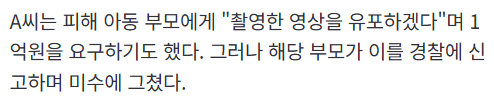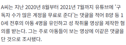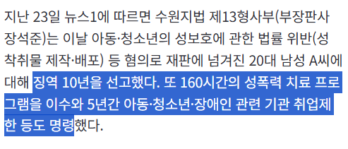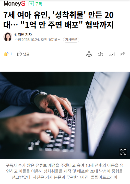 [여시뉴스데스크]7세 여아 유인, '성착취물' 만든 20대… "1억 안 주면 배포" 협박까지 작성자메론킥킥킥킥|작성시간25.10.24|조회수8,796 목록 댓글 39 글자크기 작게가 글자크기 크게가 출처: https://n.news.naver.com/mnews/article/417/0001108642?sid=1027세 여아 유인, '성착취물' 만든 20대… "1억 안 주면 배포" 협박까지초등학생 여아에게 '구독자 수가 많은 유튜브 계정을 주겠다'고 속여 성 착취물을 제작·배포한 20대 남성이 중형을 선고받았다. 지난 23일 뉴스1에 따르면 수원지법 제13형사부(부장판사 장석준)n.news.naver.com 다음검색 현재 게시글 추가 기능 열기 북마크 공유하기 신고 센터로 신고 댓글 댓글 39 댓글쓰기 답글쓰기 댓글 리스트 작성자2025년에도 건강하게 | 작성시간 25.10.24 사형시켜 제발 저런놈이 인간이냐 작성자공포의쓴맛대신매운맛 | 작성시간 25.10.24 아 진짜.... 작성자야루룰루루 | 작성시간 25.10.24 왜사냐 죽지 작성자임사장 | 작성시간 25.10.24 죽이자 찢어죽이자고 작성자재극기부대모드ON | 작성시간 25.10.24 징역 10년 참 유의미하겠다 시발 30대에 저정도 범죄이력 들고 사회에 풀려나서 뭘하겠음 저게 댓글 전체보기