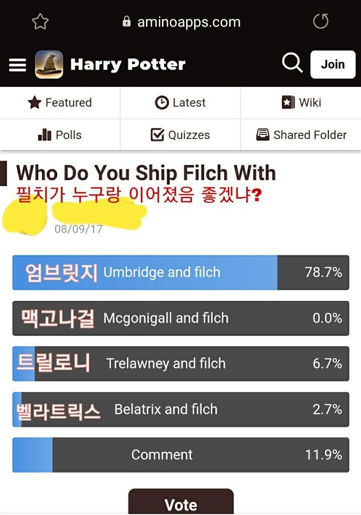 해리포터 팬 사이트 같은건데 이런 투표 올라옴 ㅋㅋㅋ