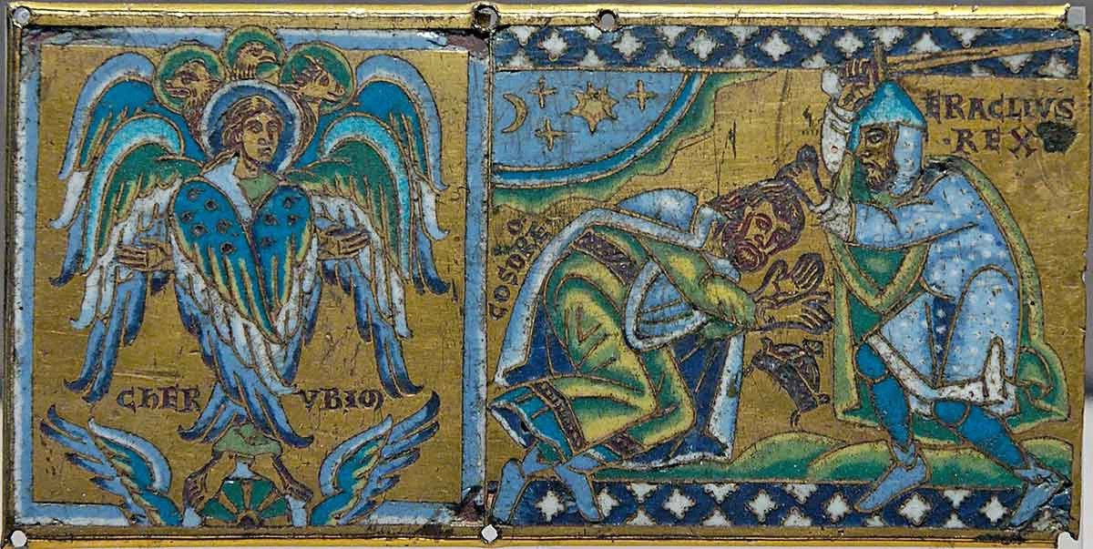 케루브(에제키엘의 환상에 나오는 케루브, 푸토가 아님)와 비잔틴 황제 이라클리오스가 사산조 왕조 호스로 2세의 항복을 받는 모습. 십자가에서 나온 명판. 금도금 구리 위에 샹르베 에나멜로 장식, 1160~1170년, 뫼즈 계곡