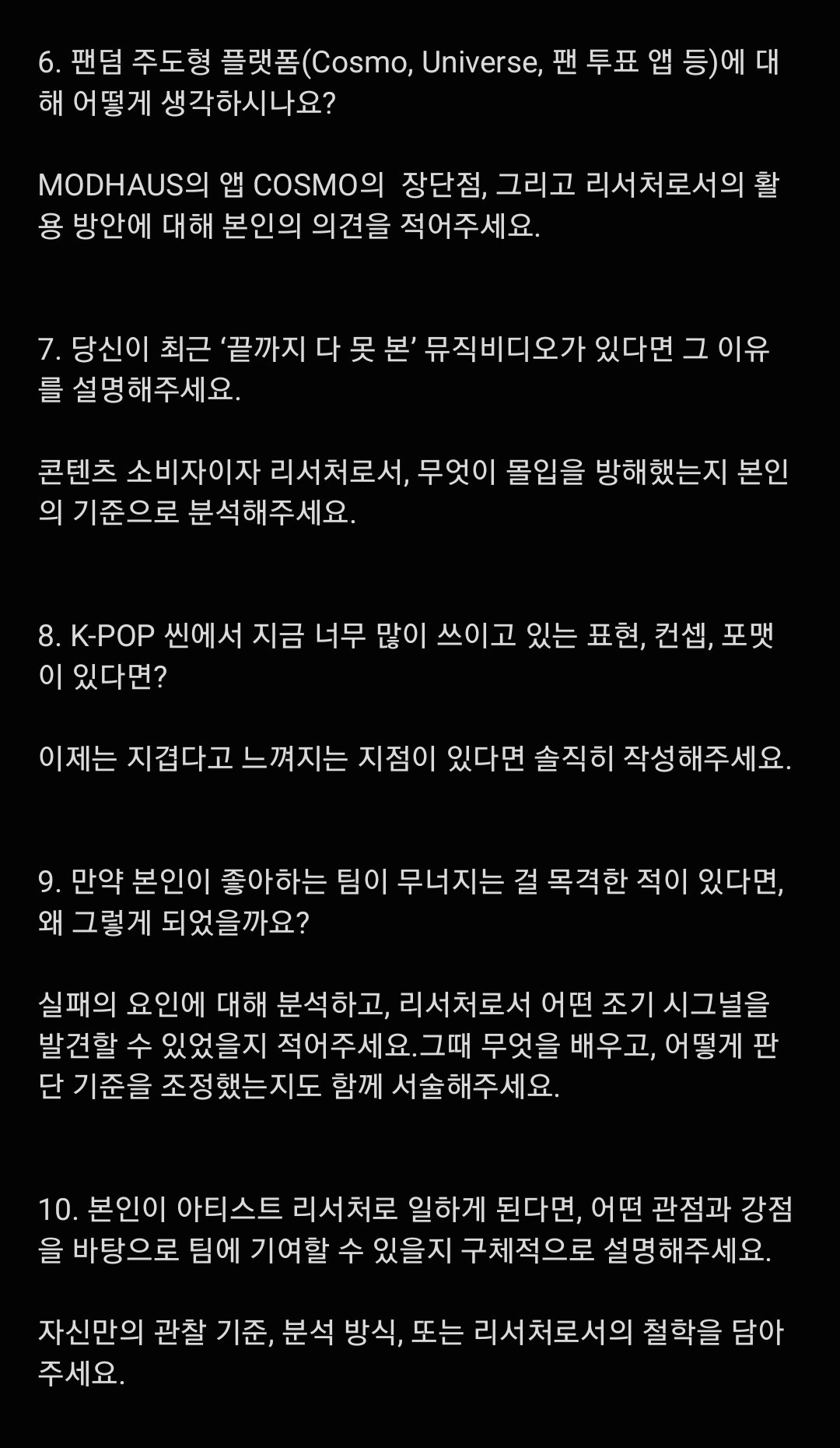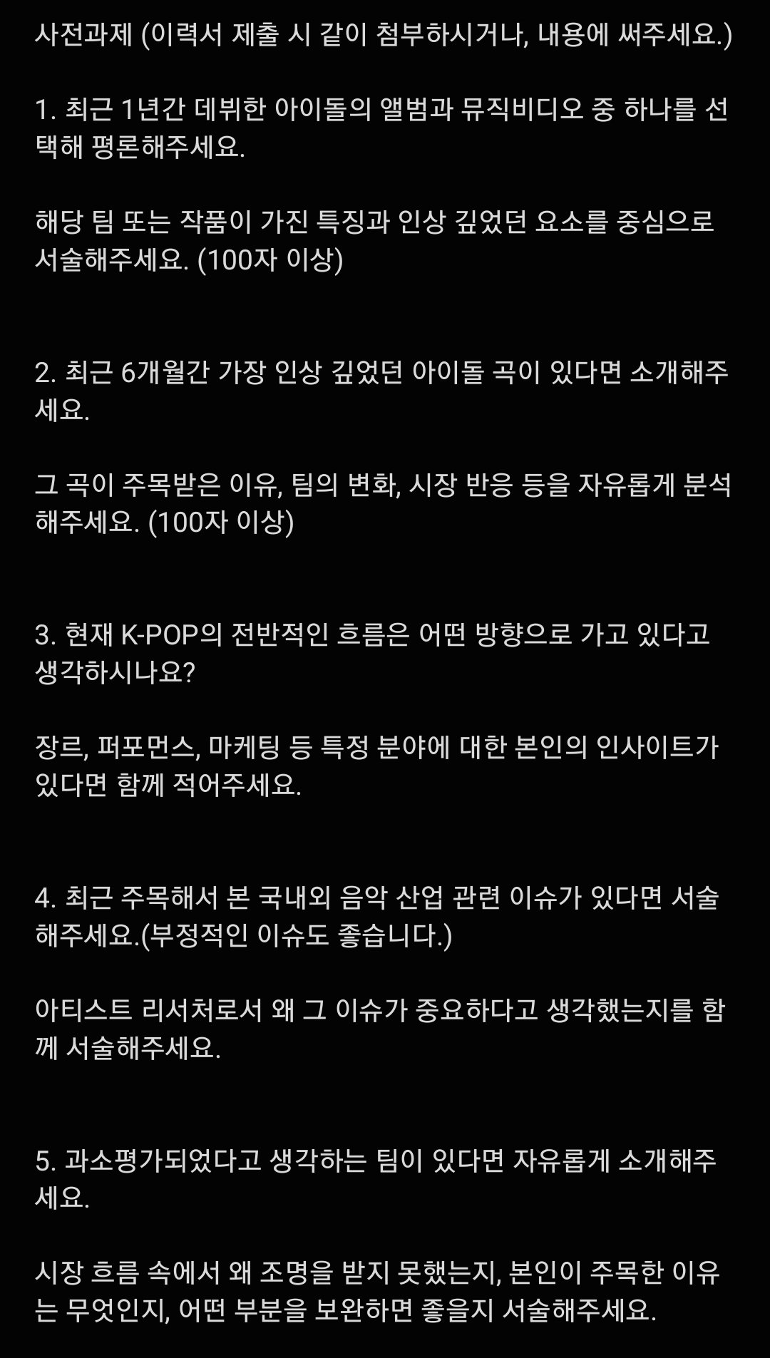 작성자팥 심은데 팥 난다 작성시간 25.10.25 사전과제는 합격 시키고 받거나 면접때 질문해야 하는것 같은데 야근 많이 하는 엔터니까 체력이랑 멘탈이 먼저 필요한거 같은데