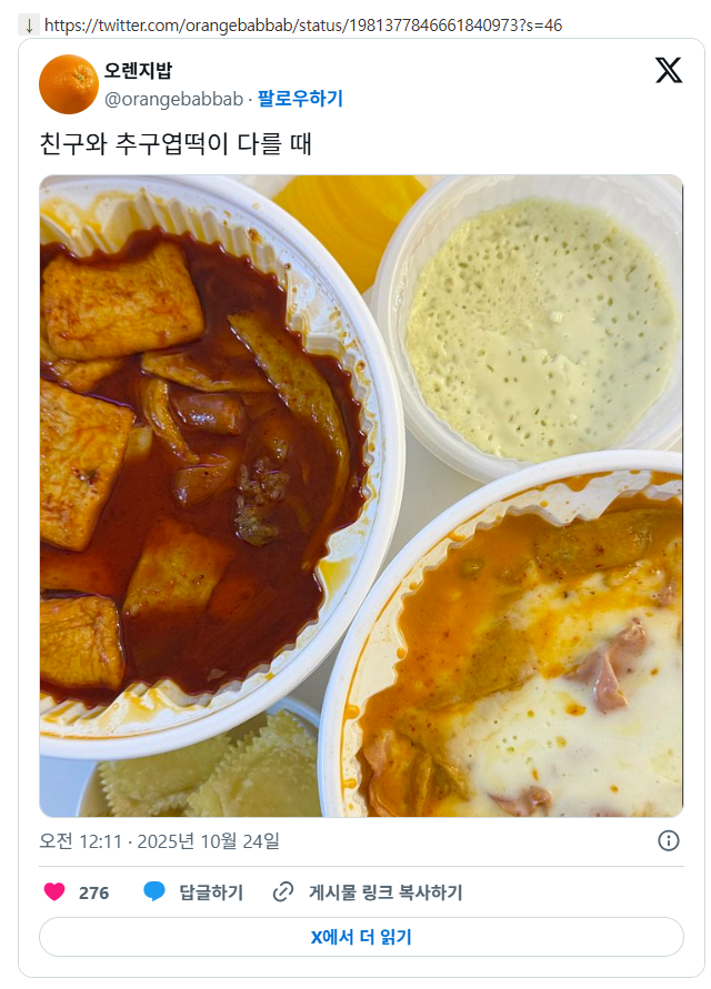 [흥미돋]친구와 추구엽떡이 다를 때 작성자은조|작성시간25.10.24|조회수86,496 목록 댓글 56 글자크기 작게가 글자크기 크게가 출처: https://x.com/orangebabbab/status/1981377846661840973 다음검색 현재 게시글 추가 기능 열기 북마크 공유하기 신고 센터로 신고 댓글 댓글 56 댓글쓰기 답글쓰기 댓글 리스트 작성자나는뿡빵이 | 작성시간 25.10.24 마라랑 로제자나 둘다 최애임 작성자압둘라전제 | 작성시간 25.10.24 마라로제 섞은 거 작성자99퍼 쿠폰을 낋여오걸아 | 작성시간 25.10.24 오리지널이나ㅜ매운맛. 작성자감시용카메라 | 작성시간 25.10.24 마라엽 가온나 작성자교촌오리 | 작성시간 25.10.25 로제 시러 오리지날 아님 마라만 팜 댓글 전체보기