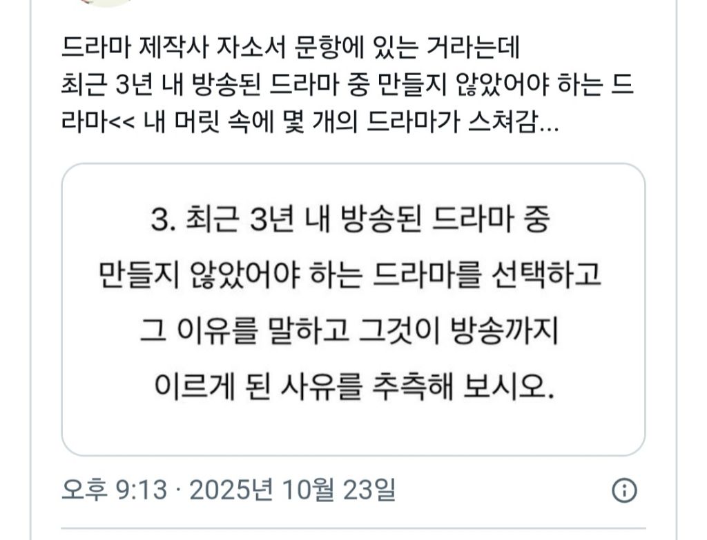 2. 방송까지 이르게된 사유를 추측할 수있을정도로 드라마를 통찰력있게 볼줄아는지(드라마제작할때 고려해야되는 사항들하고 밀접하게 관련있을 가능성높음)를 확인하는 질문같네 -