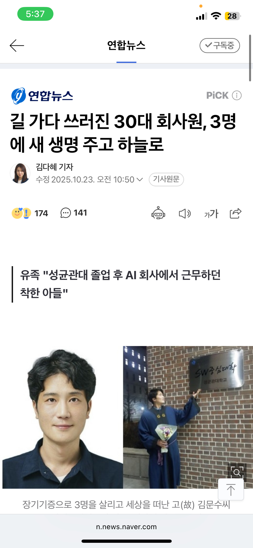 유족은 젊은 나이에 세상을 떠난 김씨가 다른 생명의 몸에서라도 살아 숨쉬기를 바라는 마음으로 장기기증을 결심했다고 한다.