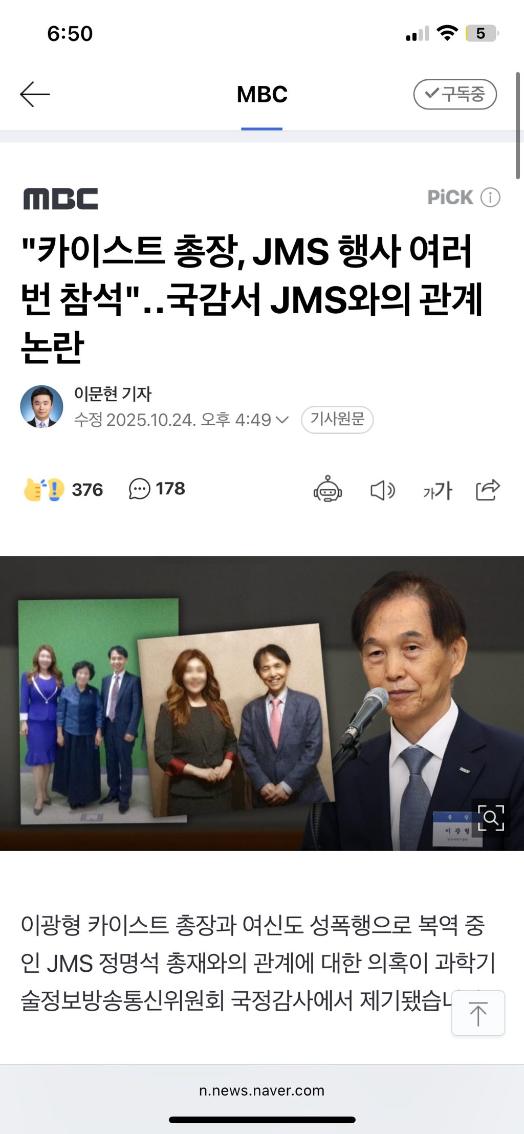 이광형 카이스트 총장과 여신도 성폭행으로 복역 중인 JMS 정명석 총재와의 관계에 대한 의혹이 과학기술정보방송통신위원회 국정감사에서 제기됐습니다.