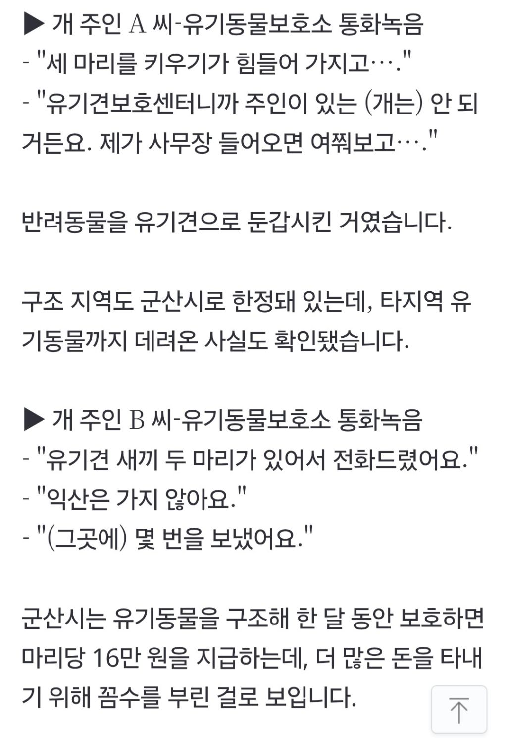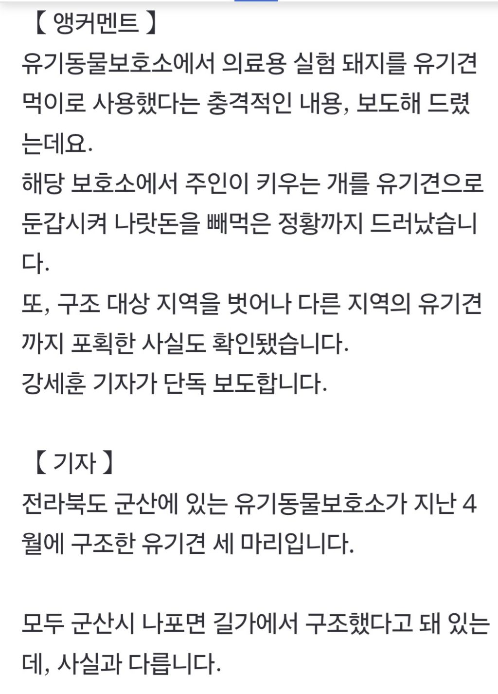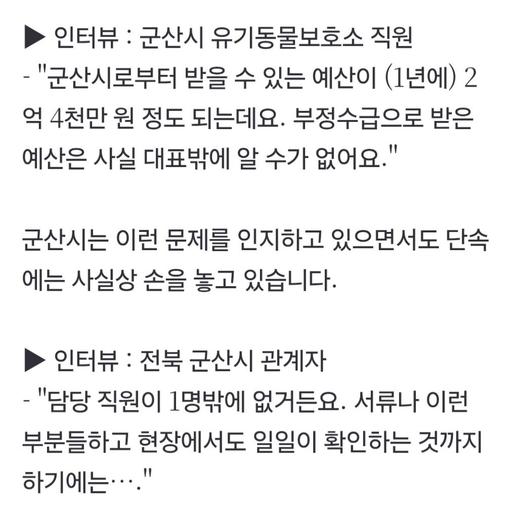 [여시뉴스데스크]키우던 개를 유기견으로 둔갑…나랏돈 빼먹은 동물보호소 (군산시 시보호소) 작성자말길게하지마쇼|작성시간25.10.24|조회수3,546 목록 댓글 3 글자크기 작게가 글자크기 크게가 출처: https://n.news.naver.com/article/057/0001905165?sid=102[단독] 키우던 개를 유기견으로 둔갑…나랏돈 빼먹은 동물보호소유기동물보호소에서 의료용 실험 돼지를 유기견 먹이로 사용했다는 충격적인 내용, 보도해 드렸는데요. 해당 보호소에서 주인이 키우는 개를 유기견으로 둔갑시켜 나랏돈을 빼먹은 정황까지 n.news.naver.com 다음검색 현재 게시글 추가 기능 열기 북마크 공유하기 신고 센터로 신고 댓글 댓글 3 댓글쓰기 답글쓰기 댓글 리스트 삭제된 댓글입니다. 답댓글 작성자말길게하지마쇼 작성자 본인 여부 작성자 | 작성시간 25.10.24 여긴 군산시에서 운영하는 지자체 시보호소라서 세금을 횡령한거야!사설도 잘알아보긴해야돼 여시말도 맞아 작성자머슬메모리 | 작성시간 25.10.24 진짜 미쳤구만...........강쥐들만 불쌍하다 진짜...ㅠㅠ 댓글 전체보기