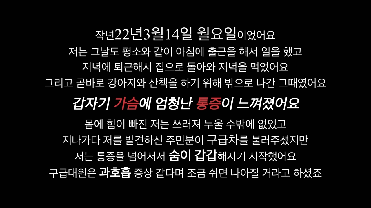 작성자엘프 작성시간 25.10.25 아니 갑자기 저랬다는게 너무 무섭다 저 분은 밖에서 지나가다 발견돼서 바로 응급차라도 불렀지만 만약에 집에 혼자 있다가 그러면....ㅠㅠ무서워 나도 가슴 저릿할 때 가끔 있는데...