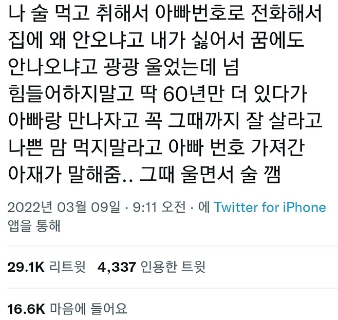 [스크랩] [눈물한방울]나 술 먹고 취해서 아빠번호로 전화했는데...jpg 작성자열빙어|작성시간25.10.24|조회수79,075 목록 댓글 22 글자크기 작게가 글자크기 크게가 출처: 술 취해서 아빠 번호로 전화함.jpg | 웃긴대학 다음검색 스크랩 원문 : *여성시대* 차분한 20대들의 알흠다운 공간 현재 게시글 추가 기능 열기 북마크 공유하기 신고 센터로 신고 댓글 댓글 22 댓글쓰기 답글쓰기 댓글 리스트 작성자낮에 뜨는 달 | 작성시간 25.10.24 ㅜㅜㅜㅜㅜㅜㅜㅜ 작성자고로고로츄 | 작성시간 25.10.24 가끔 아직 살아있었으면 어땠을까 생각함.. 문뜩문뜩 떠오르긴해 작성자느그좃본으로꺼져 | 작성시간 25.10.24 ㅠㅠ아빠 작성자내일은허니콤콤보 | 작성시간 25.10.24 ㅠㅠㅠㅠㅠㅠㅠㅠㅠㅠㅠ 작성자크리스마스이브 | 작성시간 25.10.24 ㅠㅠㅠㅠㅠㅠㅠㅠㅠㅠㅠ 댓글 전체보기