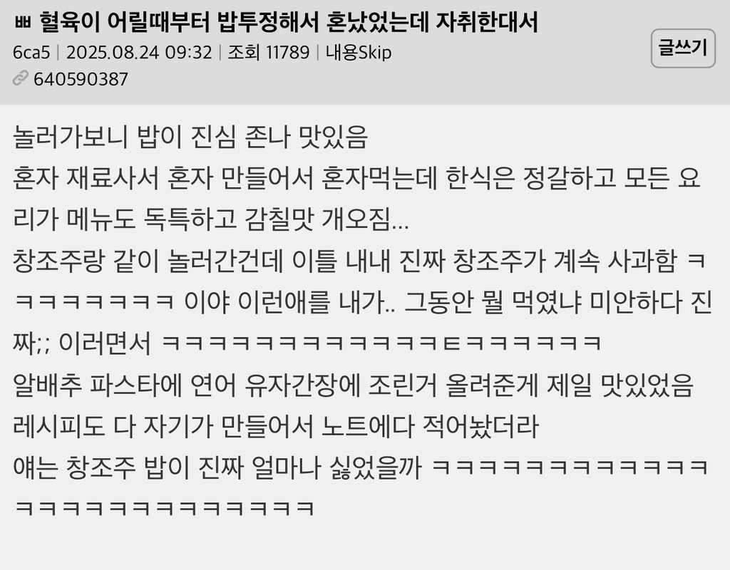 [흥미돋]혈육이 어릴때부터 밥투정해서 혼났었는데 자취한대서 작성자MoMAA|작성시간25.10.24|조회수71,408 목록 댓글 50 글자크기 작게가 글자크기 크게가 출처: https://hygall.com/640590387 다음검색 현재 게시글 추가 기능 열기 북마크 공유하기 신고 센터로 신고 댓글 댓글 50 댓글쓰기 답글쓰기 댓글 리스트 작성자또 이러신다 | 작성시간 25.10.25 쿨한 엄마가 사과하셔서 완성됨ㅋㅋㅋㅋㅋㅋㅋㅋㅋㅋ 작성자이재멍대통령 | 작성시간 25.10.25 텍스트만 봤는데 유자간장연어 먹어보고품 작성자말머리성운좋아 | 작성시간 25.10.25 레시피 공유좀 해죠요 작성자귀여운내새끼 | 작성시간 25.10.25 입맛은 환경인줄 알았는데ㅋㅋㅋㅋ타고났구나 작성자언니 나 사랑하는 개가 생겼어 | 작성시간 25.10.25 우리집호메도ㅎㅎㅎㅎㅎㅎㅎㅎㅎㅎㅎㅎㅎㅎㅎㅎㅎㅎ잔소리 ㅈㄴ 많은데 엄마보다 잘튀김... 댓글 전체보기