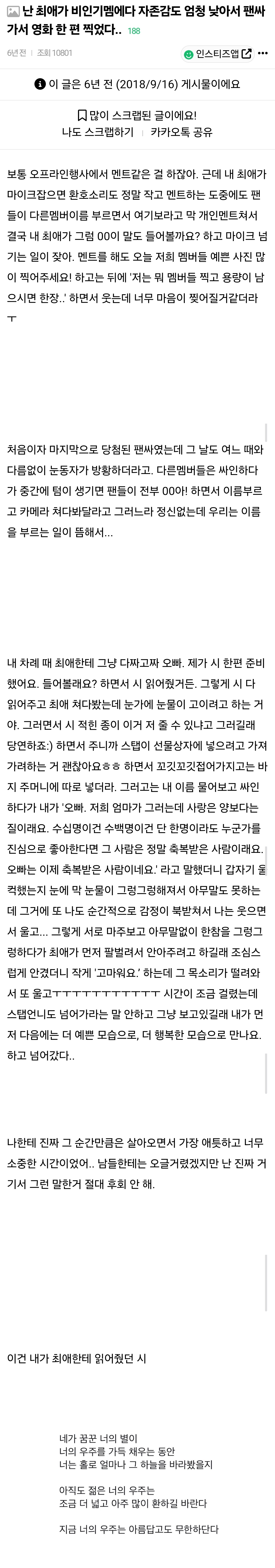 [스크랩] [흥미돋]난 최애가 비인기멤에다 자존감도 엄청 낮아서 팬싸가서 영화 한 편 찍었다.. 작성자머리칼을풀듯이어폰줄을풀지|작성시간25.10.24|조회수39,421 목록 댓글 32 글자크기 작게가 글자크기 크게가 출처: 여성시대 엿시씌 https://www.instiz.net/name_enter/57876730난 최애가 비인기멤에다 자존감도 엄청 낮아서 팬싸가서 영화 한 편 찍었다.. - 인스티즈(instiz) 보통 오프라인행사에서 멘트같은 걸 하잖아. 근데 내 최애가 마이크잡으면 환호소리도 정말 작고 멘트하는 도중에도 팬들이 다른멤버이름 부르면서 여기보라고 막 개인멘트쳐서 결국 내 최애www.instiz.net 다음검색 스크랩 원문 : *여성시대* 차분한 20대들의 알흠다운 공간 현재 게시글 추가 기능 열기 북마크 공유하기 신고 센터로 신고 댓글 댓글 32 댓글쓰기 답글쓰기 댓글 리스트 작성자춘식이는집순이 | 작성시간 25.10.25 뿌앵 ㅠㅠㅠㅠ 따뜻해 ㅠㅠㅠ 작성자서윤슬 | 작성시간 25.10.25 ㅠㅠㅠ 작성자유어스 | 작성시간 25.10.25 감동 ㅠㅠㅠㅜㅜㅜ 작성자초롱하츄핑 | 작성시간 25.10.25 울컥하네 작성자딩동댕대학원 | 작성시간 25.11.01 시를 진짜 잘썼네.. 아무 상관도 없는 내가 감동받고 감 댓글 전체보기