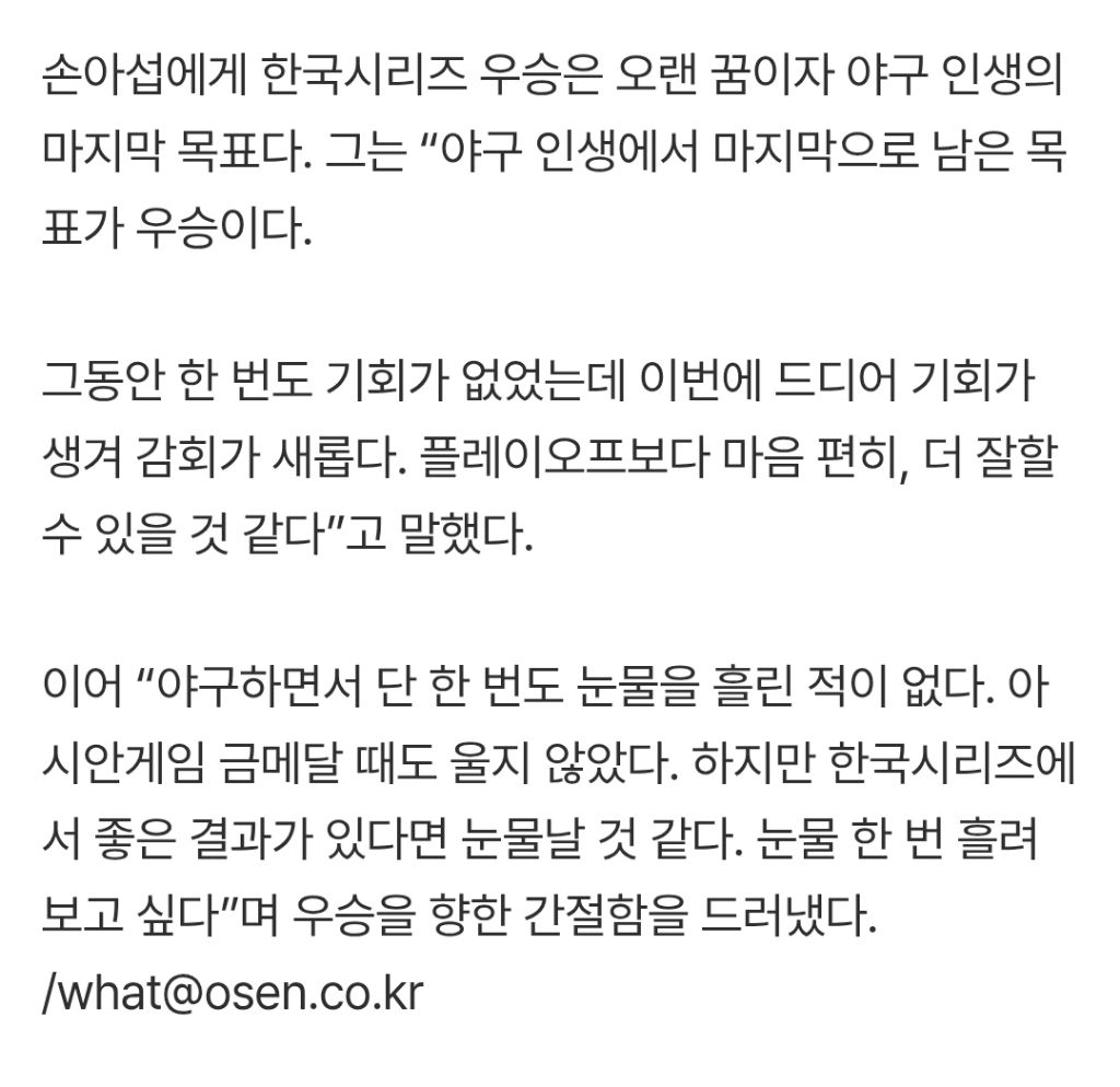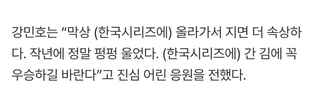 [여시뉴스데스크][KBO] “(한국시리즈에) 간 김에 꼭 우승하길” 강민호, 손아섭에게 전한 진심 [PO5] 작성자사탕과하트|작성시간25.10.24|조회수14,531 목록 댓글 34 글자크기 작게가 글자크기 크게가 출처: https://naver.me/5wNV6tfz“(한국시리즈에) 간 김에 꼭 우승하라” 강민호, 손아섭에게 전한 진심 [PO5]여기를 눌러 링크를 확인하세요m.sports.naver.com 다음검색 현재 게시글 추가 기능 열기 북마크 공유하기 신고 센터로 신고 댓글 댓글 34 댓글쓰기 답글쓰기 댓글 리스트 작성자안온한밤 | 작성시간 25.10.25 반지끼자!!! 작성자하쏭하쏭하하하쏭 | 작성시간 25.10.25 아습ㅠㅠ nc팬인데 우리도 아습의 우승바라요ㅠㅠ 우승반지 함 껴봐요 작성자BlessYou | 작성시간 25.10.25 아바디 … 우리도 내년에 반지껴요 작성자No.4 전영중 | 작성시간 25.10.25 손아섭 잘해 잘해서 꼭 반지 껴 작성자봉구beer | 작성시간 25.10.25 아섭헴 화이팅 댓글 전체보기