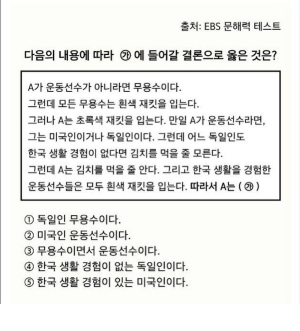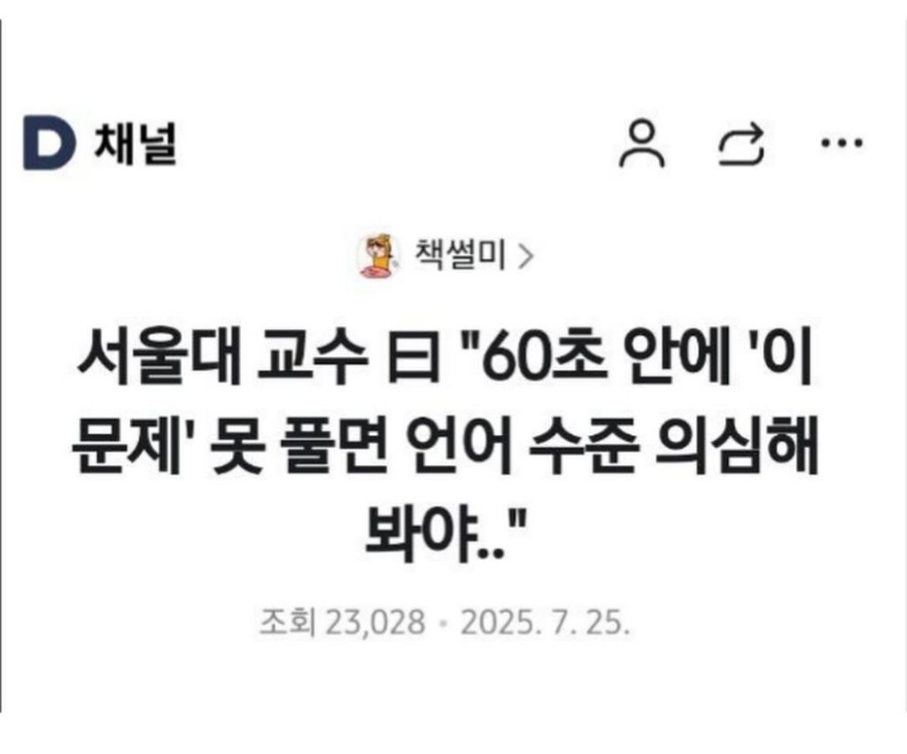 [흥미돋]EBS 문해력 테스트 작성자강원도드래요|작성시간25.10.25|조회수15,999 목록 댓글 56 글자크기 작게가 글자크기 크게가 출처: 여성시대 (강원도드래요)정답은 ?2번 미국인 운동선수이다 2번 미국인 운동선수이다. 다음검색 현재 게시글 추가 기능 열기 북마크 공유하기 신고 센터로 신고 댓글 댓글 56 댓글쓰기 답글쓰기 댓글 리스트 작성자어사재냇 | 작성시간 25.10.25 정답 다 맞춰놓고 마지막 보기를 없는 으로 잘못 보고 틀렸네 …… 작성자무슨자세여 | 작성시간 25.10.25 ... 진짜 요즘 사람들 심각하구나.... 작성자깜고냥이 | 작성시간 25.10.25 2 작성자환장하는여시 | 작성시간 25.10.25 2번.. 근데 80초걸림... 작성자바밤바가세상에서젤루좋아 | 작성시간 25.10.25 60초 넘어감..ㅠㅐ 댓글 전체보기