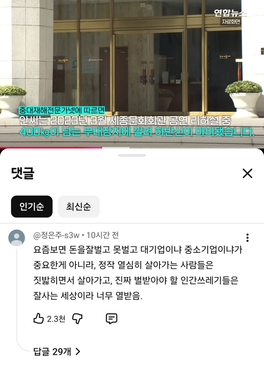 작성자와왕왕왕 작성시간 25.10.25 어제 기사보고 너무 슬프고 너무 화났어 세종문화회관 정말 실망했고 끔찍함 극장이 나서서 책임지지는 못할망정 책임전가하는거 보고 치가떨리더라; 이제 저기서 올리는 연극뮤지컬전시 전부 보고싶지도 않음 저기서 시대에 저항하는 극을 올린다? 그거야말로 역겨운 코미디라고 생각함