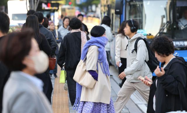 쌀쌀한 아침 날씨가 이어지는 22일 서울 광화문광장에서 시민들이 두꺼운 옷차림을 한 채 걸어가고 있다. 연합뉴스