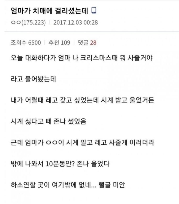 작성자라이언보이즈 작성시간 25.10.25 하... 저건 진짜... 그러지 말걸 보다 아직까지 저걸 기억하고 있다고? 그게 더 슬퍼... 나한텐 그냥 지나가는 어린마음 뿐이었는데 엄마한텐 한평생 한이 된거잖아...