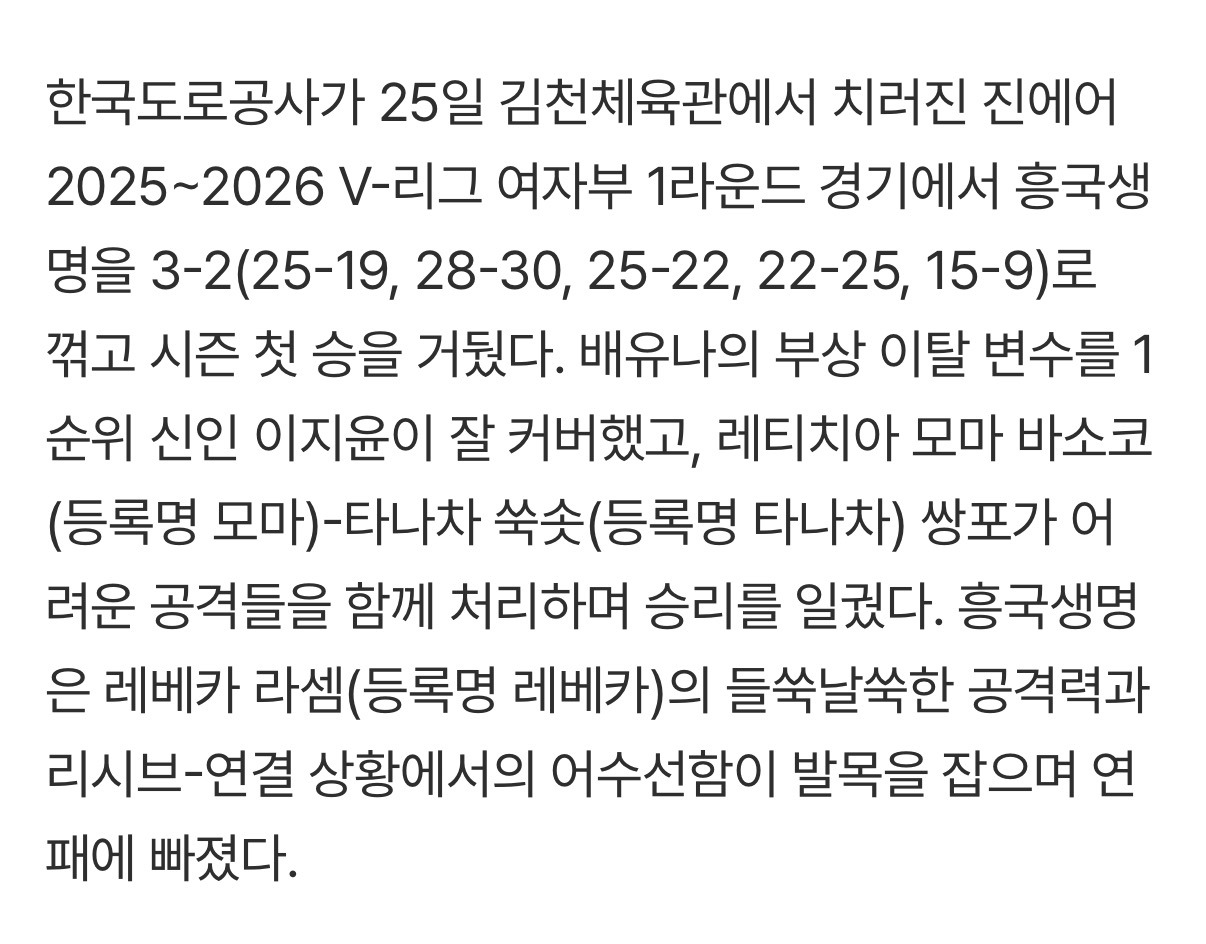 [여시뉴스데스크]이지윤의 성공적인 데뷔전! 한국도로공사, 홈에서 혈투 끝에 흥국생명 꺾고 시즌 첫 승 신고 [MD김천] 작성자슈퍼펭귄시리얼|작성시간25.10.25|조회수2,896 목록 댓글 6 글자크기 작게가 글자크기 크게가 출처: https://m.sports.naver.com/volleyball/article/117/0004001689이지윤의 성공적인 데뷔전! 한국도로공사, 홈에서 혈투 끝에 흥국생명 꺾고 시즌 첫 승 신고 [MD여기를 눌러 링크를 확인하세요m.sports.naver.com 다음검색 현재 게시글 추가 기능 열기 북마크 공유하기 신고 센터로 신고 댓글 댓글 6 댓글쓰기 답글쓰기 댓글 리스트 작성자누구나때는온다 | 작성시간 25.10.25 이지윤 대박 작성자바쩡아의나라 | 작성시간 25.10.25 지윤이 아기인데 침착해서 놀램 크게될 선수야 작성자AURUM | 작성시간 25.10.25 와 모마 이제 도로공사에 있어? 국내에서 엄청 오래 뛰는구나 ㅋㅋㅋㅋㅋ 작성자배구봐주세요 | 작성시간 25.10.25 진짜 김종민 무슨 복이냐 작성자제발좀 | 작성시간 25.10.25 아까 2세트 흥국생명이 이긴 거까지 봤는데 결국 도로공사가 이겼구나!! 댓글 전체보기