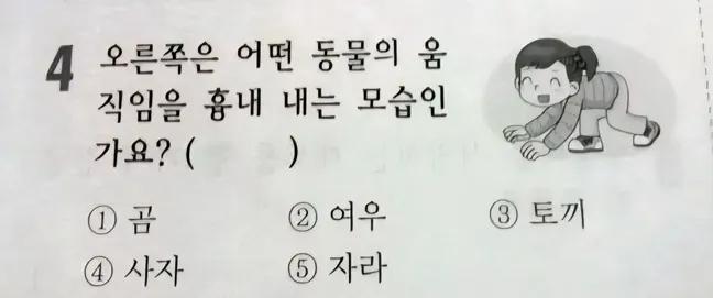 작성자자색고구머 작성시간 25.10.26 여우? 토끼라면 깡총을 표현하려고 쪼그려앉거나 귀를 표햔할 것 같고 곰은 직립보행으로 서서 가슴을 치거나 할듯 사자라면 울음소리 내면서 포효하거나 갈기를 나타나는데 주력할 것이고 자라는 엉금엉금을 기는 모습을 표현할테니 답은 애교 많은 여우를 표현하려 웃으면서 4족 보행하는 모습을 그린 것이 아닐까.