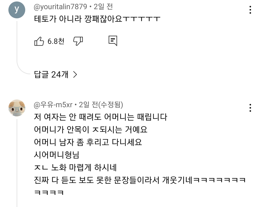 [스크랩] [흥미돋]ㅈㄴ모든 대사가 골때리는 강유미 테토며느리 작성자돌연사 박물관|작성시간25.10.25|조회수29,562 목록 댓글 45 글자크기 작게가 글자크기 크게가 출처: 여성시대 흔적https://youtu.be/IORHj8DTI5c?si=c0y67iKoXzd16apE아 진짜 대사 하나하나가돌아버리겠음ㅋㅋㅋㅋㅋㅋㅋㅋ마지막 반전 있음ㅋㅋㅋ 다음검색 스크랩 원문 : *여성시대* 차분한 20대들의 알흠다운 공간 현재 게시글 추가 기능 열기 북마크 공유하기 신고 센터로 신고 댓글 댓글 45 댓글쓰기 답글쓰기 댓글 리스트 답댓글 작성자HARARA | 작성시간 25.10.26 아 미치겠다 오늘 2탄이 나왔구나 ㅋㅋㅋㅋㅋㄱㅋㄱㅋ 작성자baijingting | 작성시간 25.10.26 ㅋㅋㅋㅋㅋㅋㅋㅋㅋㅅㅂ ㅈㄴ잘해 작성자보르르 | 작성시간 25.10.26 시어머니형님ㅋㅋㅋㅋㅋ 작성자브래 | 작성시간 25.10.26 아 유튭댓글개우ㅜ셔 작성자이재명ㄷㅐ통령 | 작성시간 25.10.26 노화마려운게 젤웃겨나보람 개좋음ㅋㄱㅋ 댓글 전체보기