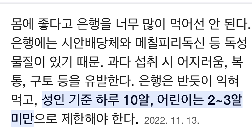 [스크랩] [흥미돋]적게 먹어야 하는 게 아쉬운 요리 갑.jpg 작성자돌연사 박물관|작성시간25.10.25|조회수53,544 목록 댓글 59 글자크기 작게가 글자크기 크게가 출처 : 여성시대 슈펄사이는 은행쪼끄매서 간에 기별도 안 가는데 하루 섭취량이 개적음한 임상보고를 보면 36세 여성은 은행 70~80개를 먹고 4시간 후 구토와 발작을 일으켰고어느 41세 여성은 60개 정도의 은행을 먹은 후 4시간이 지나 오심, 구토, 어지럼증과 팔다리 떨림이 발생했다고 함 다음검색 스크랩 원문 : *여성시대* 차분한 20대들의 알흠다운 공간 현재 게시글 추가 기능 열기 북마크 공유하기 신고 센터로 신고 댓글 댓글 59 댓글쓰기 답글쓰기 댓글 리스트 작성자Poppypop | 작성시간 25.10.26 50개 정도는 배틸나고 힘들더라 30개까진 ㄱㅊ ㅎ 작성자옥시페탈룸 | 작성시간 25.10.26 40개정도 먹어도 멀쩡하던데 작성자화랑 | 작성시간 25.10.26 엄마가 8개넘게먹지말라고 맨날 딱8개만 줬어.. 작성자명수온 | 작성시간 25.10.26 한번먹을때 수십알먹는데 미chin... 작성자그분은 계속 모르셔 | 작성시간 25.10.26 +키위 댓글 전체보기