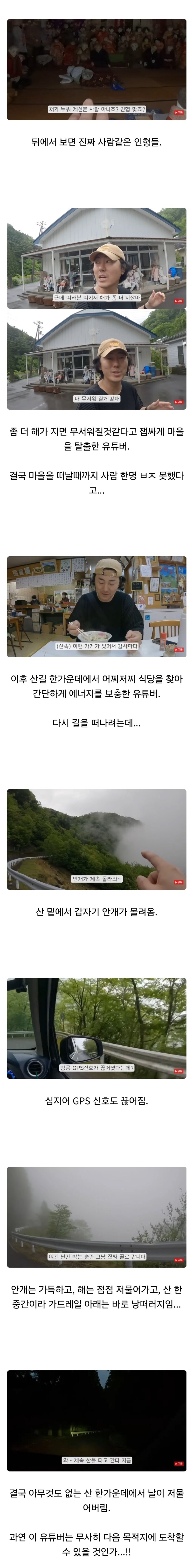 저러고 이제 컴컴한 밤길을 뚫고 운전하던 유튜버 앞에 나고로마을 입구의 모습이 다시 한 번 나타나면 공포게임 하나 뚝딱 완성일듯...??