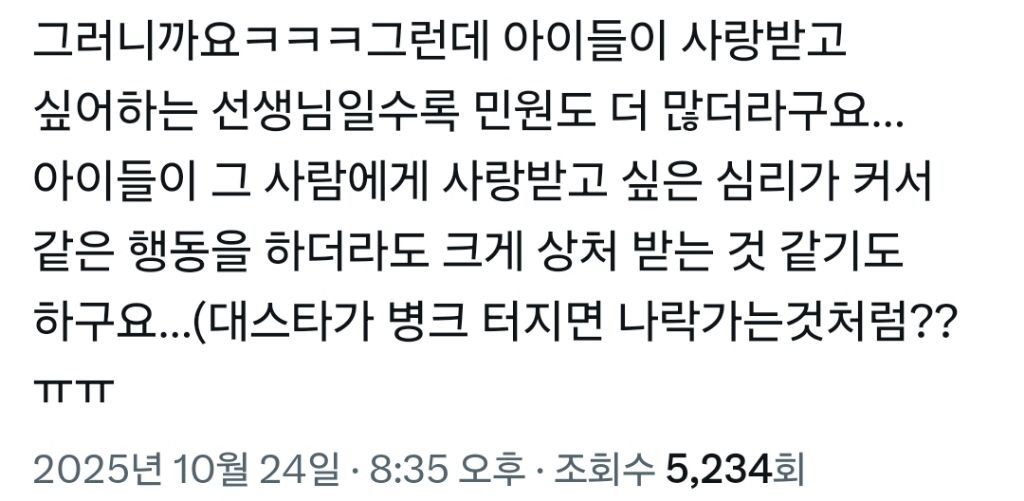 답댓글 작성자소뮨24종개입 작성시간 25.10.26 나 선생님인데 묵묵히 본인꺼 열심히 하는 애들 진짜 예쁨... 날라리들ㅋㅋㅋ관심 주는건 그저 그런 애들 자극 안시키려고^^... 예뻐서 관심 주는건 절대 아니야 ㅋㅋㅋ 물론 예쁜짓 할때는 예쁨.. 암튼 어떤 것이든 열심히 하는 애들은 선생님들이 다 알아!