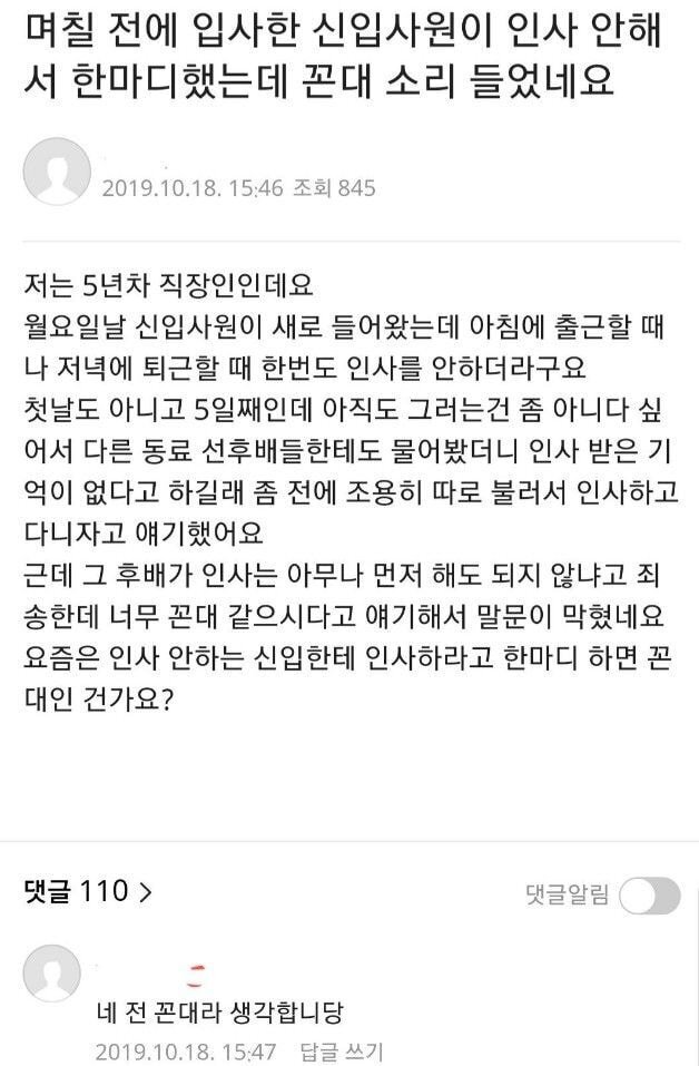 [스크랩] [흥미돋]인사안하는 신입사원 꼰대논란.JPG 작성자돌연사 박물관|작성시간25.10.26|조회수75,149 목록 댓글 174 글자크기 작게가 글자크기 크게가 . 다음검색 스크랩 원문 : 도탁스 (DOTAX) 현재 게시글 추가 기능 열기 북마크 공유하기 신고 센터로 신고 댓글 댓글 174 댓글쓰기 답글쓰기 댓글 리스트 작성자히비스커스 티 | 작성시간 25.10.26 유치원 안다녔나,,, 작성자햄볶햐 | 작성시간 25.10.26 아니 인사는 기본이지 이걸로 꼰대갈리를 한다고...? 작성자기꺼이함께가주지 | 작성시간 25.10.27 인사를 쳐해야지 작성자찌개장인 | 작성시간 25.10.27 편의점을 가도 인사하는데 세상에나 작성자파바바바밥 | 작성시간 25.11.02 지 기분꼬우면 다 꼰대랜다 댓글 전체보기