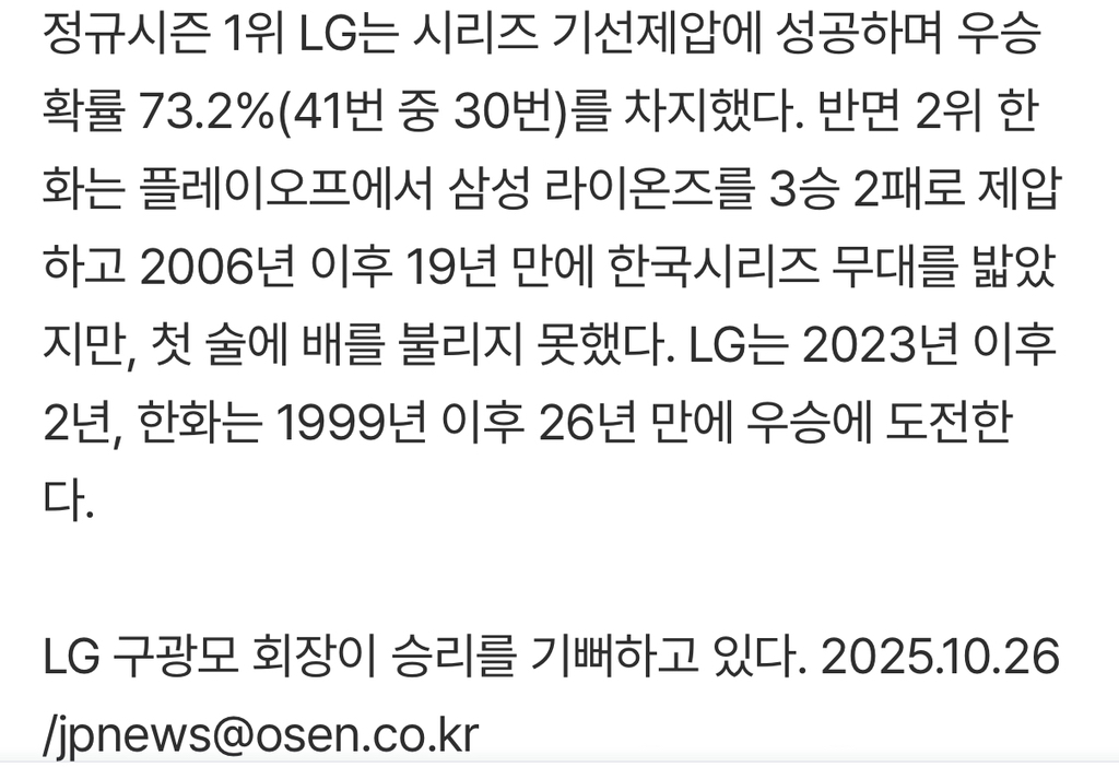 [여시뉴스데스크][사진]구광모 회장, LG KS 1차전 승리에 주먹 불끈 작성자보리차한잔|작성시간25.10.26|조회수13,458 목록 댓글 16 글자크기 작게가 글자크기 크게가 출처: https://naver.me/xHmK4iRM[사진]구광모 회장, LG KS 1차전 승리에 주먹 불끈여기를 눌러 링크를 확인하세요m.sports.naver.com얍! 하게 나온 게 웃겨서 가져옴 다음검색 현재 게시글 추가 기능 열기 북마크 공유하기 신고 센터로 신고 댓글 댓글 16 댓글쓰기 답글쓰기 댓글 리스트 작성자젤리점심도시락 | 작성시간 25.10.26 오늘 광모 왔구나ㅋㅋㅋㅋ 머플러 내놔 작성자이이정 | 작성시간 25.10.26 머플러 제발 좀 팔아 작성자알이하나그란데 | 작성시간 25.10.26 머플러 찵여 작성자Zhao Lusi | 작성시간 25.10.26 머플러 나도 줘💢💢💢💢💢💢 작성자비염죽어버려 | 작성시간 25.10.26 광모 지금 야구 볼때니 댓글 전체보기