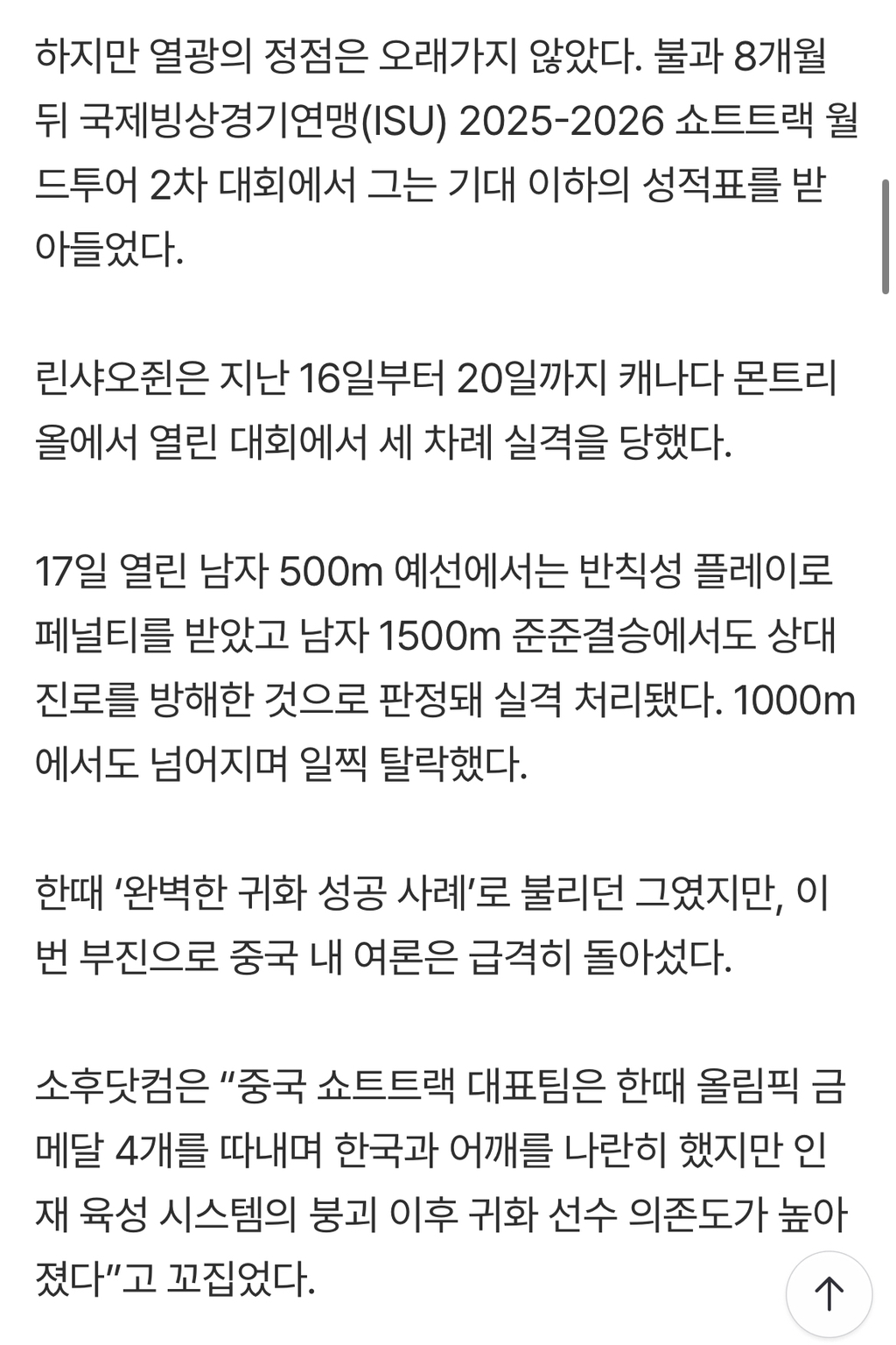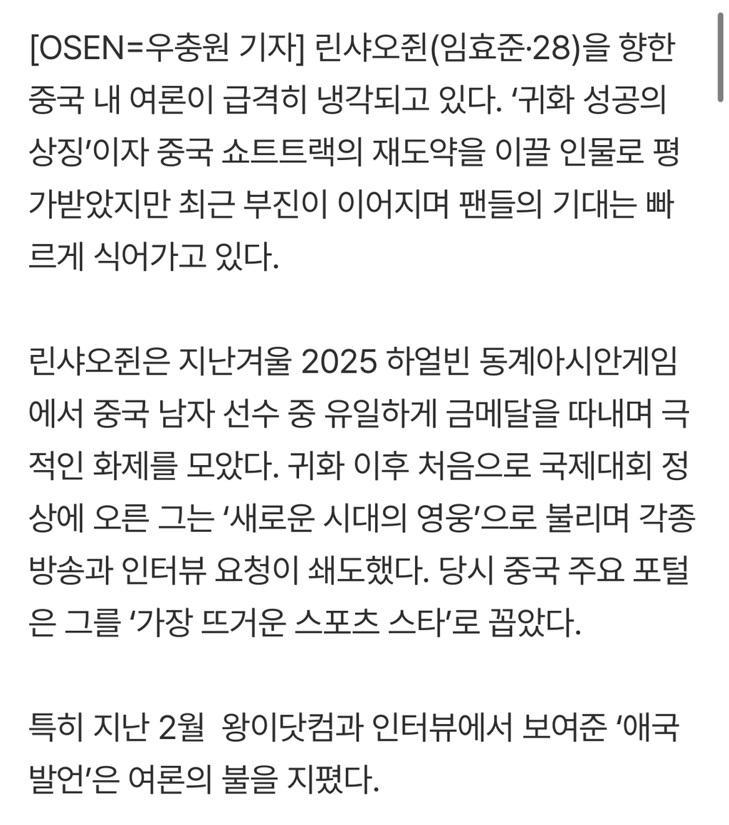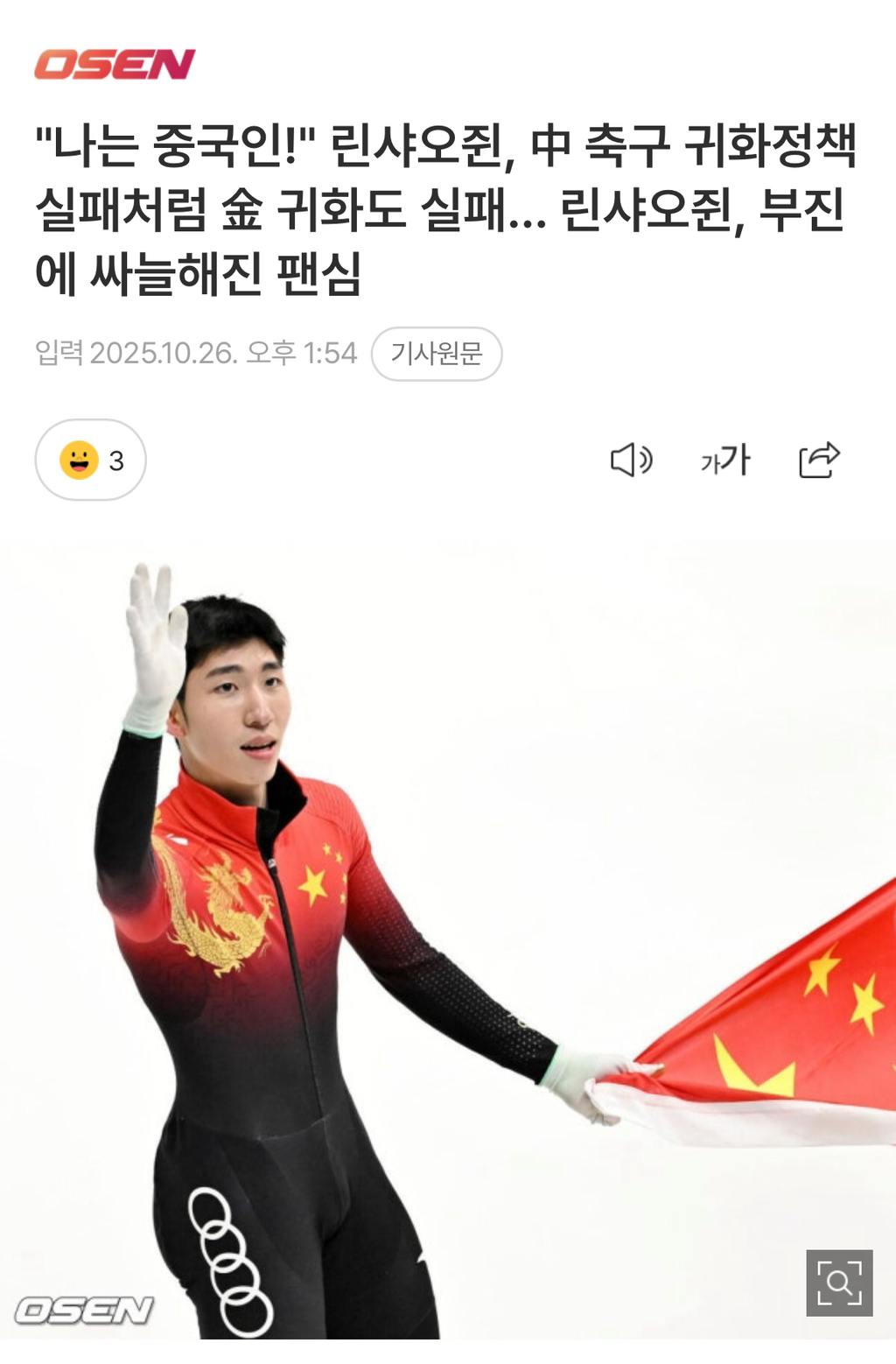 [여시뉴스데스크]"나는 중국인!" 린샤오쥔, 中 축구 귀화정책 실패처럼 金 귀화도 실패... 린샤오쥔, 부진에 싸늘해진 팬심