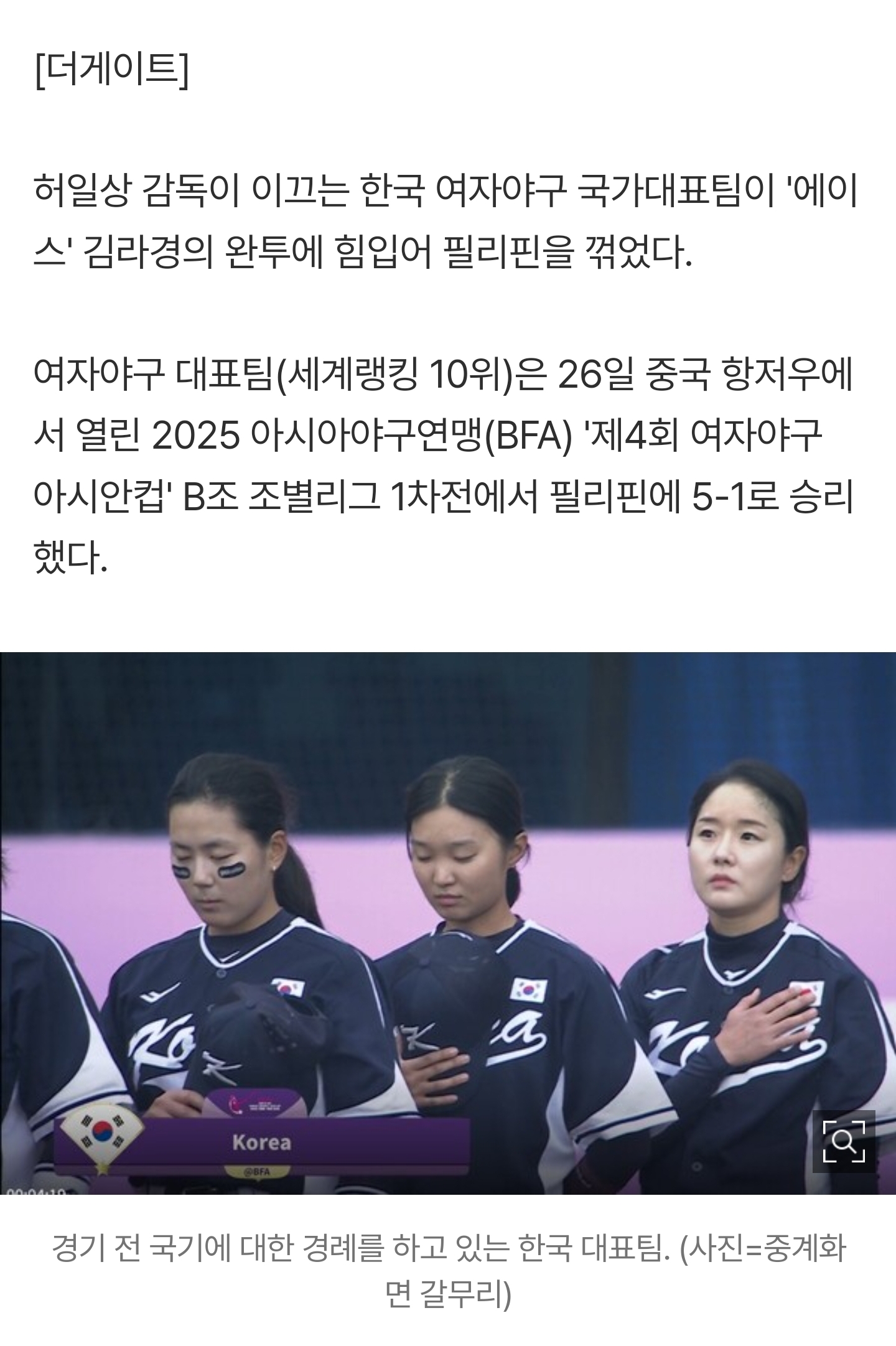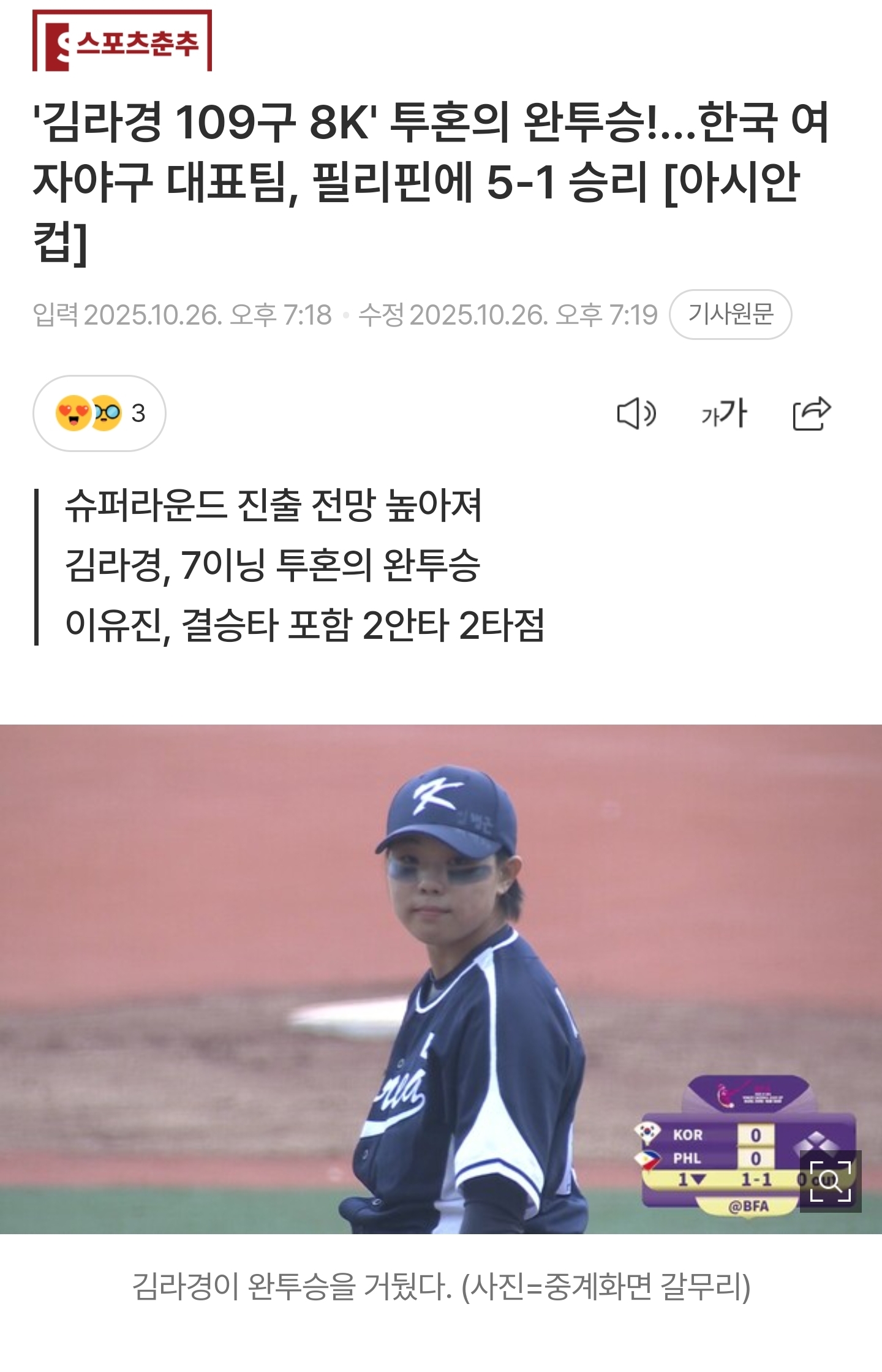 [여시뉴스데스크]'김라경 109구 8K' 투혼의 완투승!...한국 여자야구 대표팀, 필리핀에 5-1 승리 [아시안컵] 작성자초코코니|작성시간25.10.26|조회수3,939 목록 댓글 41 글자크기 작게가 글자크기 크게가 출처: https://naver.me/xU4pg4SZ'김라경 109구 8K' 투혼의 완투승!...한국 여자야구 대표팀, 필리핀에 5-1 승리 [아시안컵]여기를 눌러 링크를 확인하세요m.sports.naver.com후략 / 전문은 출처 다음검색 현재 게시글 추가 기능 열기 북마크 공유하기 신고 센터로 신고 댓글 댓글 41 댓글쓰기 답글쓰기 댓글 리스트 작성자망할 짓을 했기 때문 아닐까요? | 작성시간 25.10.26 라경 선수 너무 멋짐부상 수술 재활 너무 고생했고그 길 진짜 응원합니다 작성자제발좀 | 작성시간 25.10.26 와 완투 멋지다... 작성자프로젝트레인보우 | 작성시간 25.10.26 라경선수 화이팅 작성자내인생완전굿 | 작성시간 25.10.26 ㅠㅠㅠㅠㅠ미친 너무 멋있다 작성자뿌수고다시만듦 | 작성시간 25.10.26 대박 멋있어 ㅠㅠ 댓글 전체보기