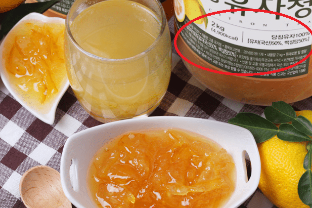 밑에 작게 쓰여진 원재료 및 함량도 유자 50%, 백설탕 50% 말고는 아무것도 안 들어가 있음