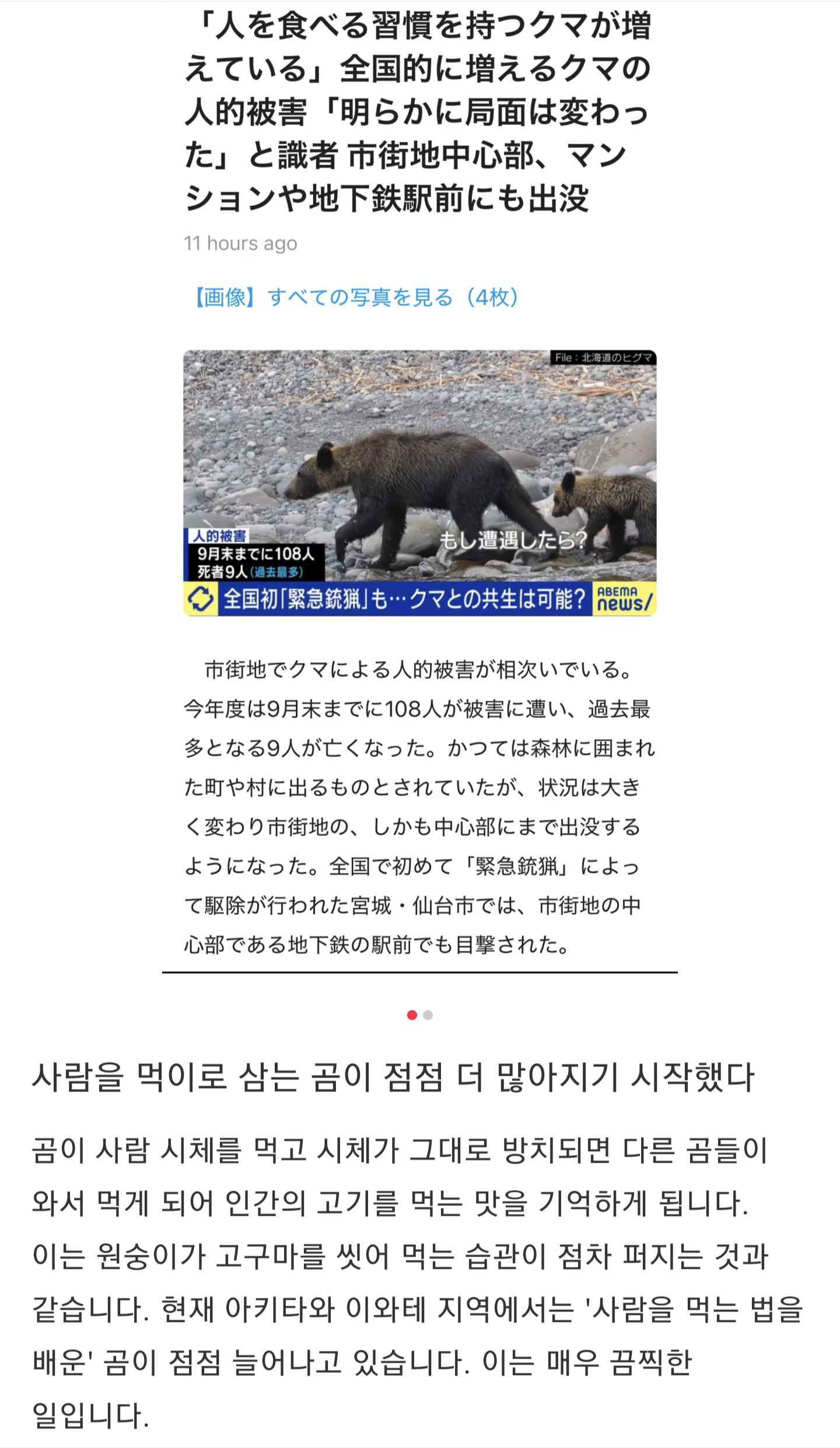 실제론 뉴스로 보도되는 사건들보다 훨 많은데 일본 시골도 노인층이 대부분이고 곰들이 사람 먹고 버려진 남은 부패한 시체를 또 다른 곰들이 그 냄새 맡고 인육 맛 알게되는 곰들도 많나봄