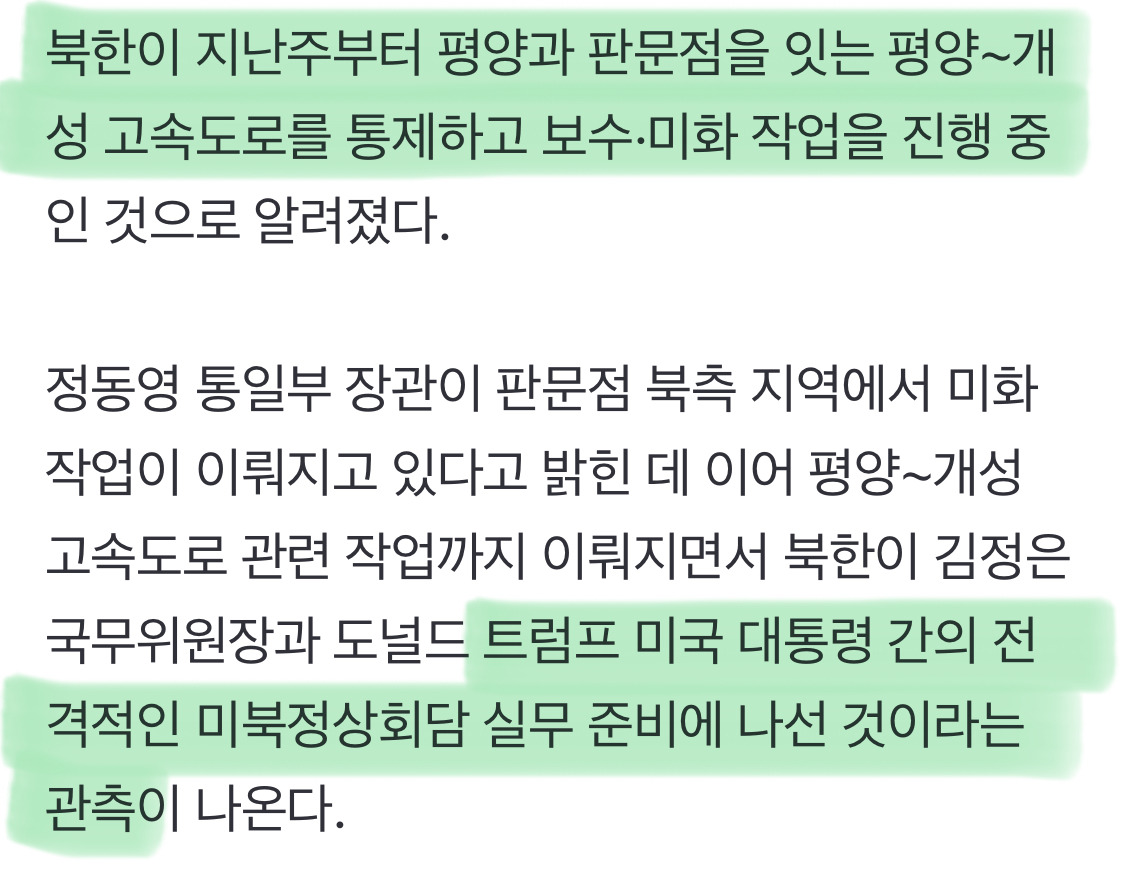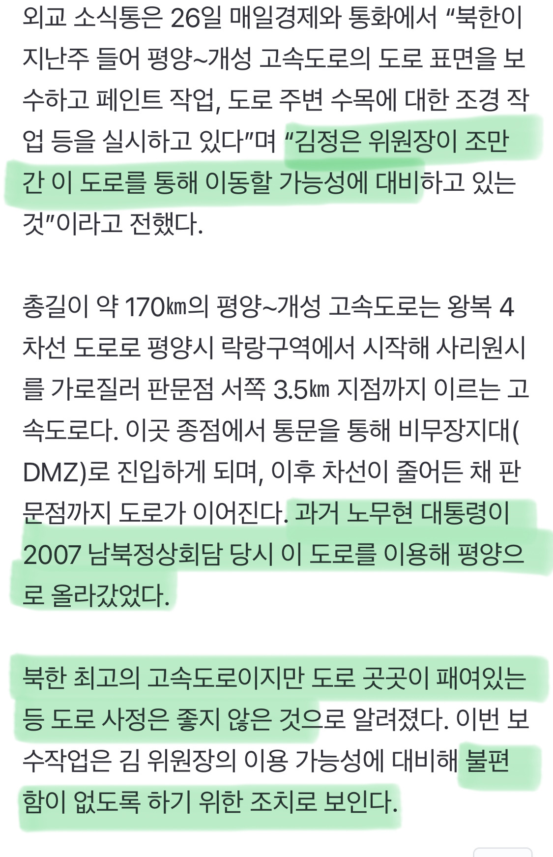 [여시뉴스데스크][단독] 북한, 평양~개성 고속도로 보수·미화작업… 김정은 판문점行 준비하나 작성자(본인닉네임).|작성시간25.10.27|조회수1,546 목록 댓글 16 글자크기 작게가 글자크기 크게가 출처https://n.news.naver.com/article/009/0005579297?sid=100 다음검색 현재 게시글 추가 기능 열기 북마크 공유하기 신고 센터로 신고 댓글 댓글 16 댓글쓰기 답글쓰기 댓글 리스트 작성자순수마들렌 | 작성시간 25.10.27 오 작성자고깔 | 작성시간 25.10.27 오 작성자호롤롤롤호 | 작성시간 25.10.27 오 작성자자색고구머 | 작성시간 25.10.27 정은아!!!! 작성자냘링닝 | 작성시간 25.10.27 정으나!!! 댓글 전체보기