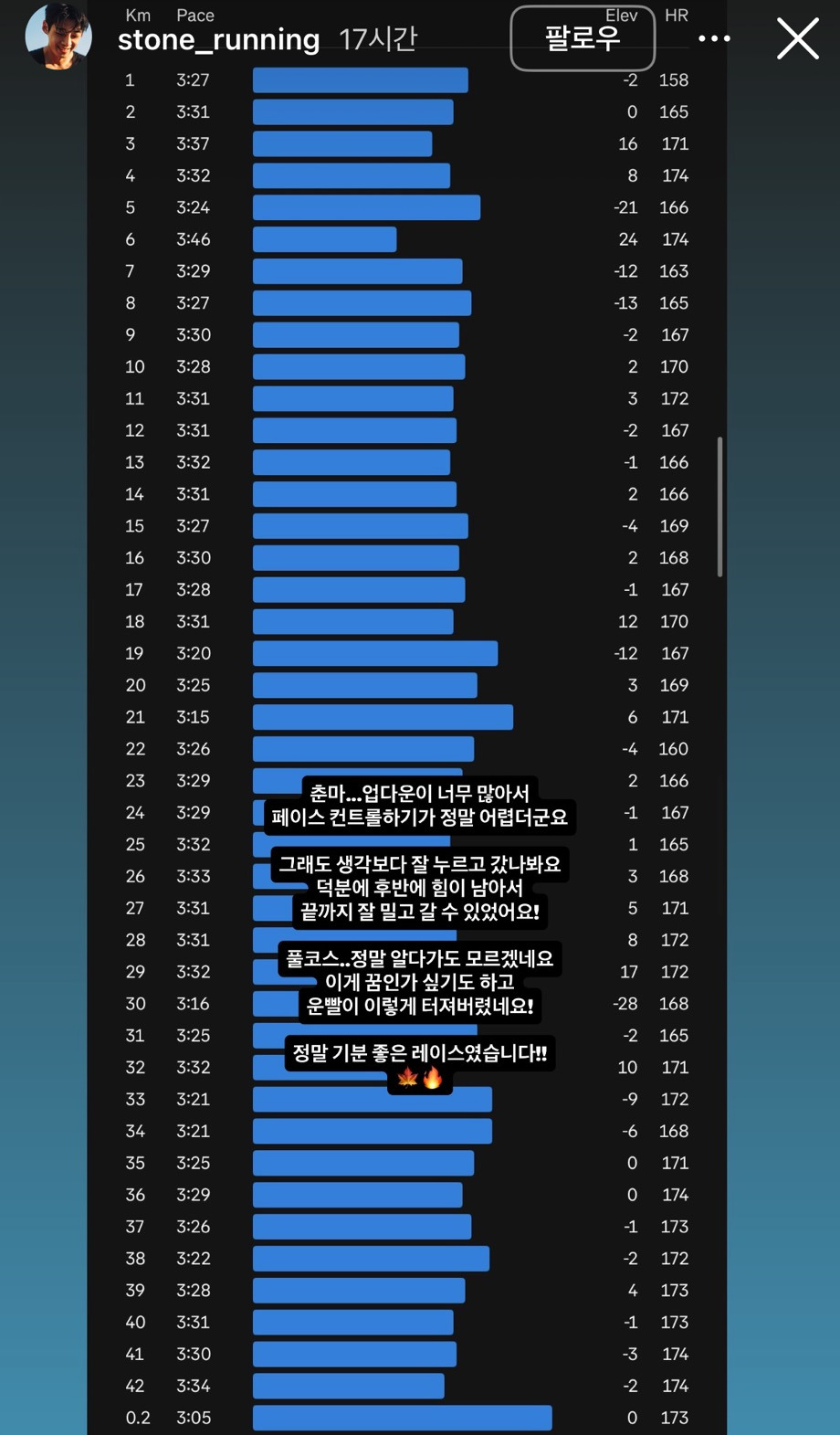 ++ 인스타에서 가져온 그의 이번 춘마 페이스