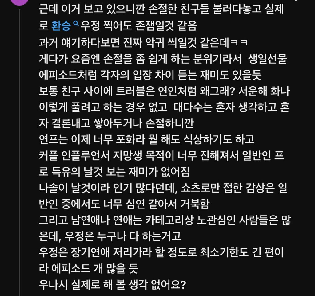 작성자나는부자된다 작성시간 25.10.31 난 애매하게 연락 끊긴 친구 넘 보고싶긴함..