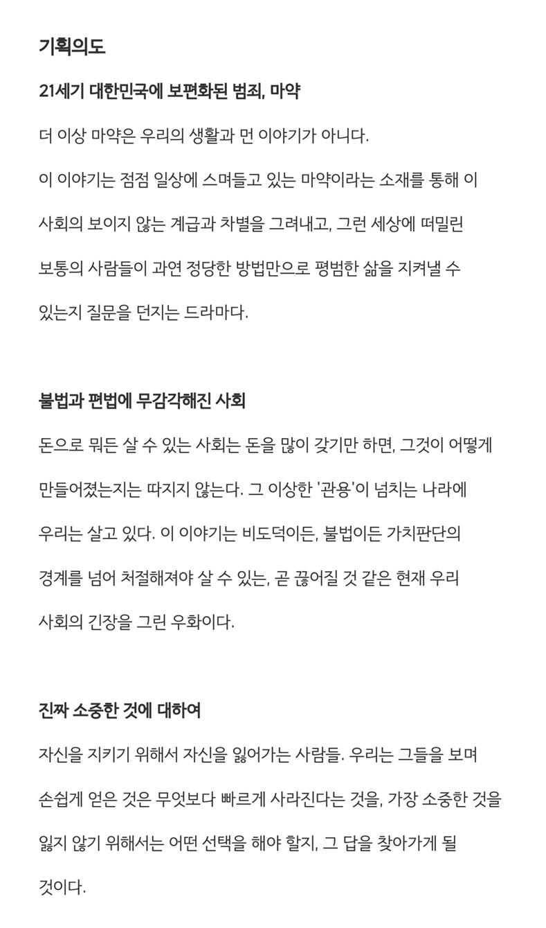 마약 관련 드라마인데 범죄 미화 없어서 좋았는데