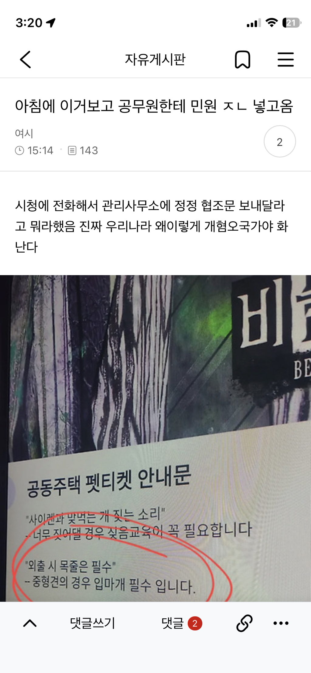 작성자하루루르 작성시간 25.10.28 관리사무소에 직접 말하면 될일인데 어차피 민원넣어봤자 관리사무소에 공문보낼수밖에없는 일인데