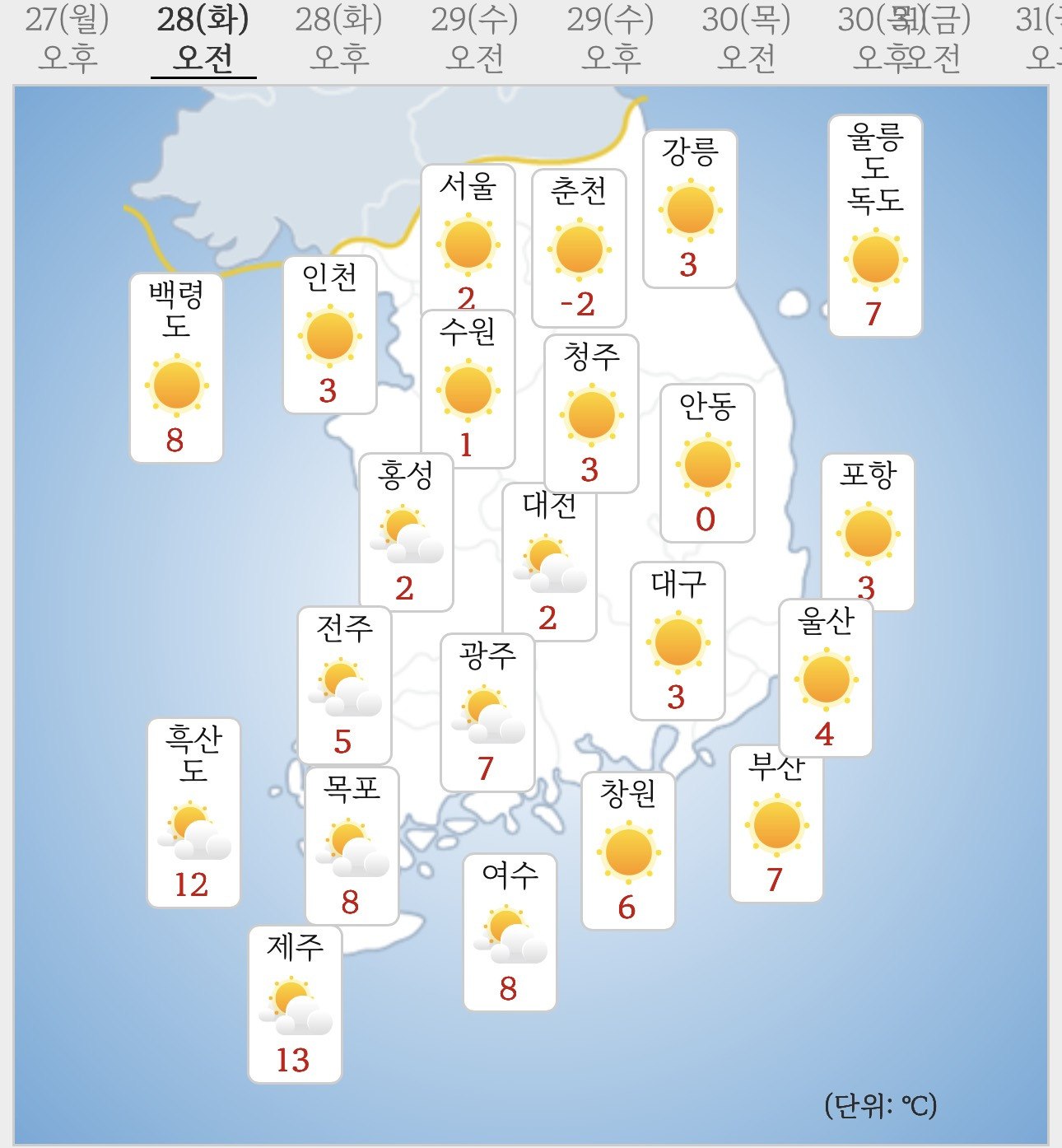 - 특히, 우리나라 북쪽에서 찬 공기가 남하하면서 경북권에 한파특보가 발표(27일 21시 발효)된 가운데, 내일(28일) 아침 기온은 오늘(27일)보다 1~5℃가량 더 떨어지고, 경북권을 중심으로 10℃ 안팎으로 큰 폭으로 떨어지겠으며, 내일부터 전국 내륙을 중심으로 낮과 밤의 기온차가 15℃ 안팎으로 크겠으니, 환절기 건강관리에 유의하기 바랍니다.