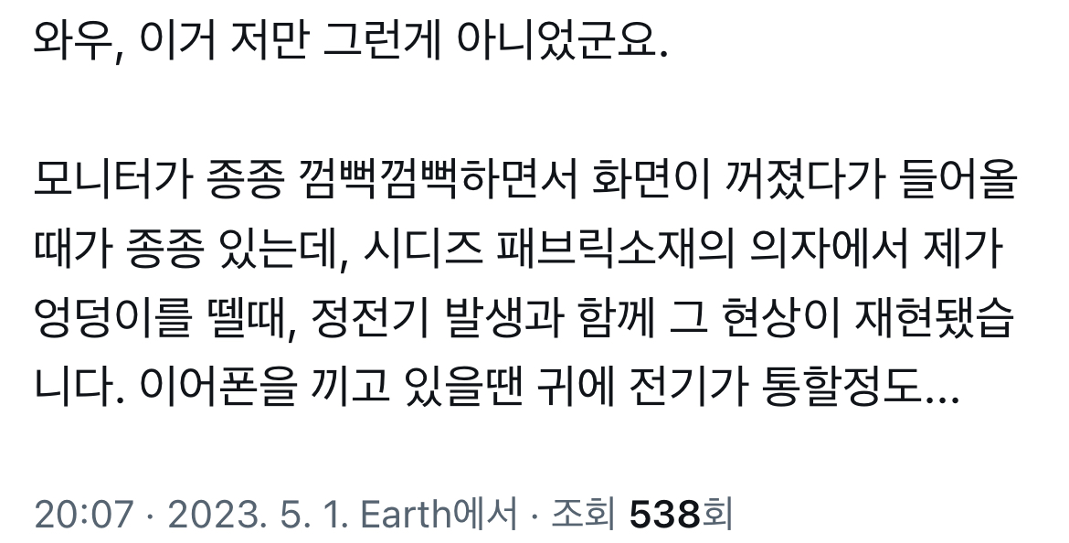 작성자수수수수퍼어 작성시간 25.10.27 헐 뭐지 나 회사 왼쪽 모니터 자꾸 앞 사람이 일어날때마다 그러는데 한번 봐야겠다 내일