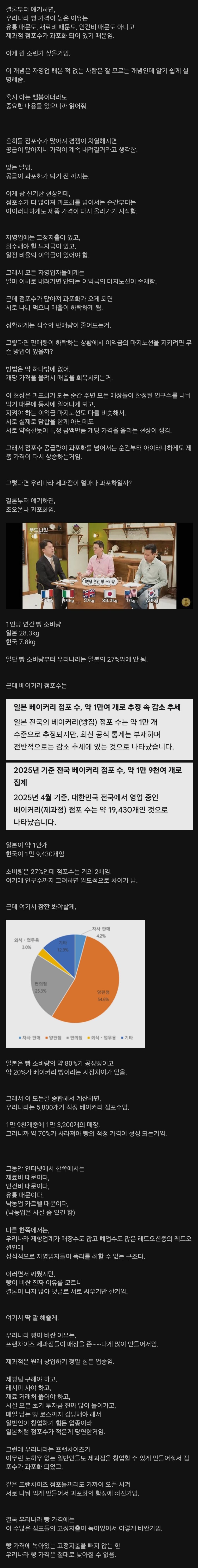 [스크랩] [흥미돋]제빵업계 20년차가 빵이 비싼 진짜 이유 알려줌 작성자돌연사 박물관|작성시간25.10.27|조회수36,608 목록 댓글 34 글자크기 작게가 글자크기 크게가 출처: https://theqoo.net/square/3895843484더쿠 - 제빵업계 20년차가 빵이 비싼 진짜 이유 알려줌여기를 눌러 링크를 확인하세요theqoo.net개인적으로 지금까지 본 이유중에 가장 납득감 다음검색 스크랩 원문 : *여성시대* 차분한 20대들의 알흠다운 공간 현재 게시글 추가 기능 열기 북마크 공유하기 신고 센터로 신고 댓글 댓글 34 댓글쓰기 답글쓰기 댓글 리스트 작성자아베베베 | 작성시간 25.10.28 공급이 많다고 싸지는것도 아니구나 작성자건강기원행복기원 | 작성시간 25.10.28 아 좀 납득된다 작성자freedom__ | 작성시간 25.10.28 탈출구가 없으니 죄다 자영업으로 몰리는거지 모 .. 작성자헴샨드이치 | 작성시간 25.10.28 네다섯개사면삼만원.. 작성자아카페라데 | 작성시간 25.10.28 빵집뿐만 아니라 자영업자 수가 많아서 물가가 미친듯이 오르는 거... 그래서 정부는 탄탄한 기업을 만드는데 신경써야해 댓글 전체보기