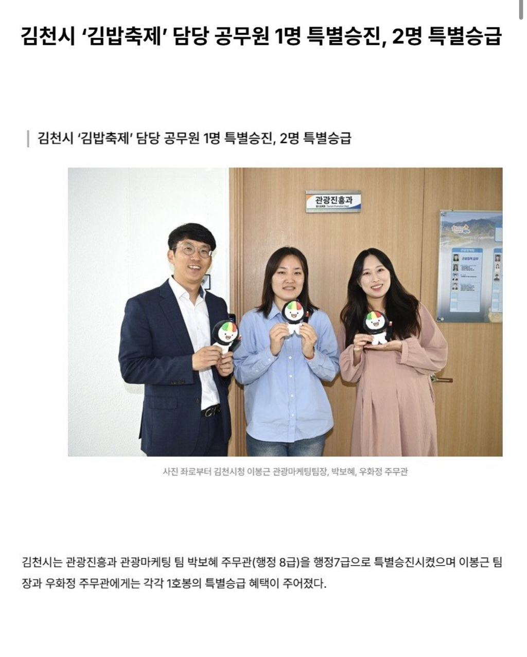 [흥미돋]김천 김밥축제 담당 공무원들 근황 작성자머리부터발끝까지한있슈|작성시간25.10.27|조회수91,993 목록 댓글 312 글자크기 작게가 글자크기 크게가 출처:https://theqoo.net/hot/3968350533아이디어 낸 공무원 아이디어 받아들여서 밀어붙인 팀장 주관한 주무관 3명 모두 특별승진 + 특별승급 다음검색 현재 게시글 추가 기능 열기 북마크 공유하기 신고 센터로 신고 댓글 댓글 312 댓글쓰기 답글쓰기 댓글 리스트 작성자올해액땜완 | 작성시간 25.10.29 짝짝짝 축하합니다!!!! 넘 잘됐어 작성자세일러 코스모스 | 작성시간 25.11.03 와 다 젊다잉 작성자풍성충 | 작성시간 25.11.04 개멋있어 이래야지 이게 맞지 작성자감자맛있으 | 작성시간 25.11.07 이야 승진할만하시지👍👍 작성자무맛 | 작성시간 25.11.09 캬.. 이게 나라지 댓글 전체보기