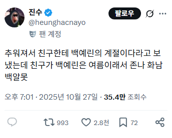 [흥미돋]추워져서 친구한테 백예린의 계절이다라고 보냈는데 친구가 백예린은 여름이래서 존나 화남 백알못 작성자(본인 닉네임),|작성시간25.10.28|조회수21,686 목록 댓글 205 글자크기 작게가 글자크기 크게가 출처: https://x.com/heunghacnayo/status/1982749429720584614 다음검색 현재 게시글 추가 기능 열기 북마크 공유하기 신고 센터로 신고 댓글 댓글 205 댓글쓰기 답글쓰기 댓글 리스트 작성자토체프 | 작성시간 25.10.29 여름 작성자분노r아서p해라 | 작성시간 25.10.30 목소리가 가을이야 작성자여어우라댜 | 작성시간 25.10.30 겨울스퀘어가 찐인데.. 작성자Whereyouatnow | 작성시간 25.10.31 겨울 ㅜㅜㅜㅜㅜ love you on christmas 들어야헌다고 작성자멱살잡힌고양이 | 작성시간 25.11.01 여름 댓글 전체보기