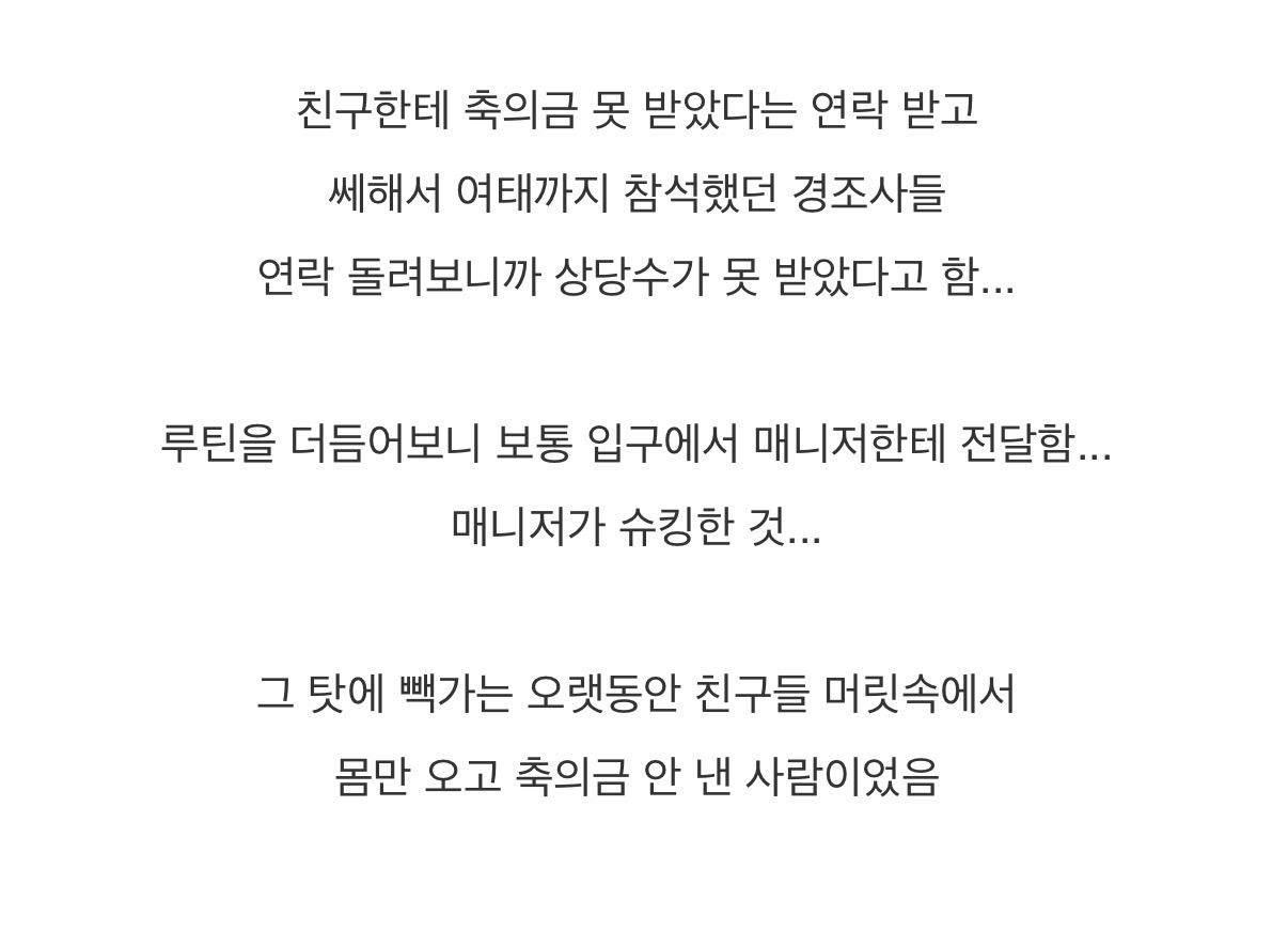[흥미돋]오랫동안 축의금 안 내는 사람 취급 당한 빽가.jpg 작성자지9별|작성시간25.10.28|조회수58,984 목록 댓글 159 글자크기 작게가 글자크기 크게가 출처: https://theqoo.net/square/3968938019더쿠 - 오랫동안 축의금 안 내는 사람 취급 당한 빽가.jpg여기를 눌러 링크를 확인하세요theqoo.net 다음검색 현재 게시글 추가 기능 열기 북마크 공유하기 신고 센터로 신고 댓글 댓글 159 댓글쓰기 답글쓰기 댓글 리스트 작성자Nelionalo | 작성시간 25.10.29 ㅁㅊ거아냐??? 깜빵ㄱ 작성자올해액땜완 | 작성시간 25.10.29 와 미쳤다 진짜 작성자huntr/x | 작성시간 25.10.30 미쳣나 작성자조아짱조아 | 작성시간 25.10.30 와 범죄 작성자세일러 코스모스 | 작성시간 25.11.04 와 미칀 댓글 전체보기