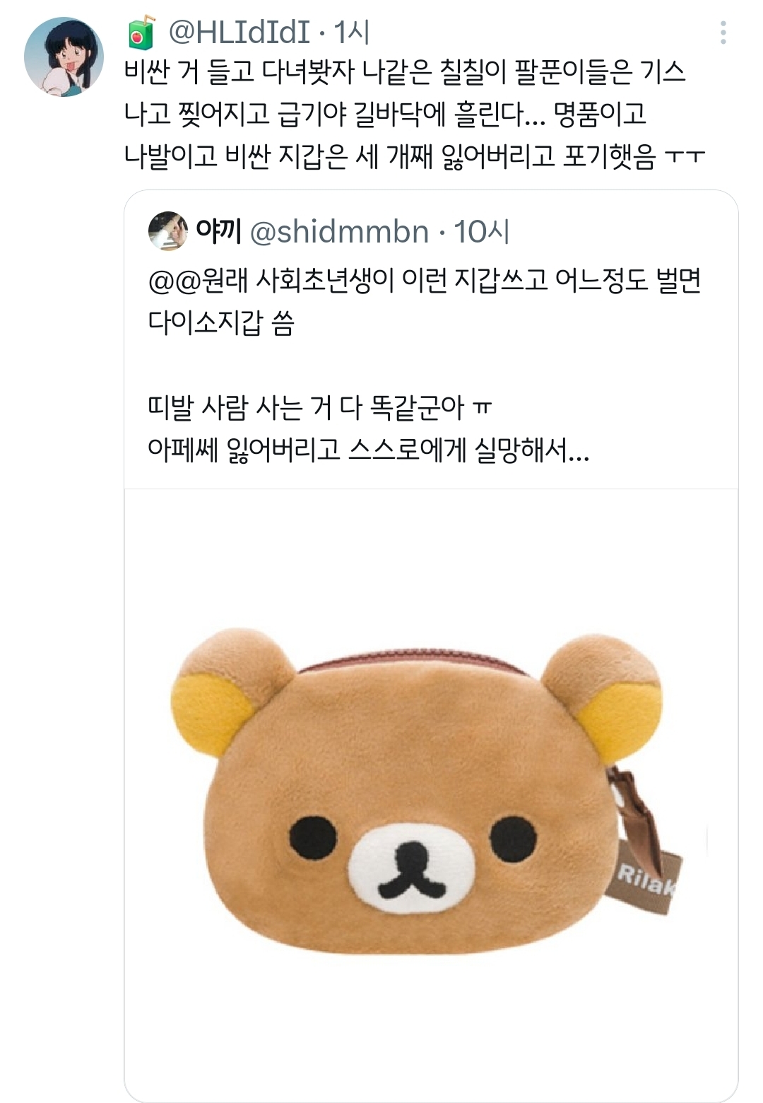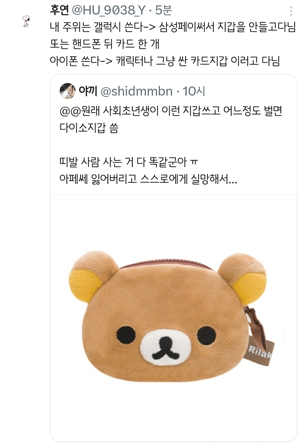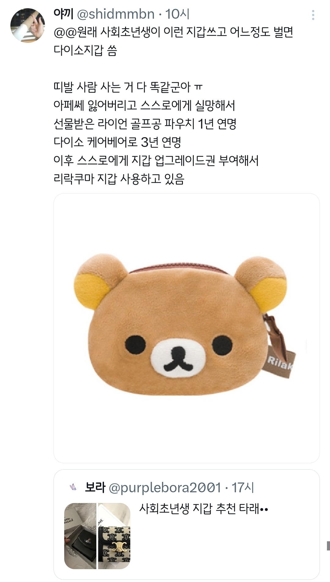 작성자대서양돌고래 작성시간 25.10.28 나도 다이소 곰돌이 지갑씀ㅋㅋㅋ 가죽지갑 불편해 근데 여자들 너무 귀여워....