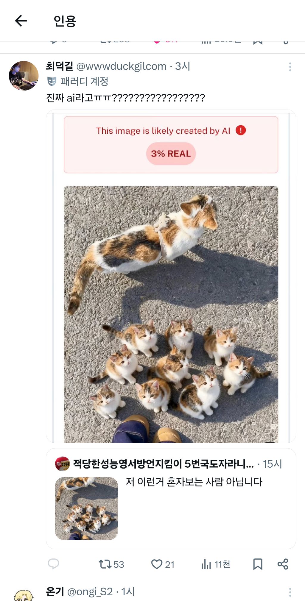 작성자헐ㄹㄹㄹㄹ 작성시간 25.10.29 애기냥이들 표정이 다 똑같아서 ai일줄 알았음