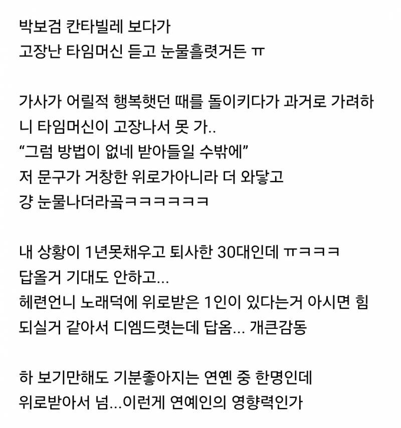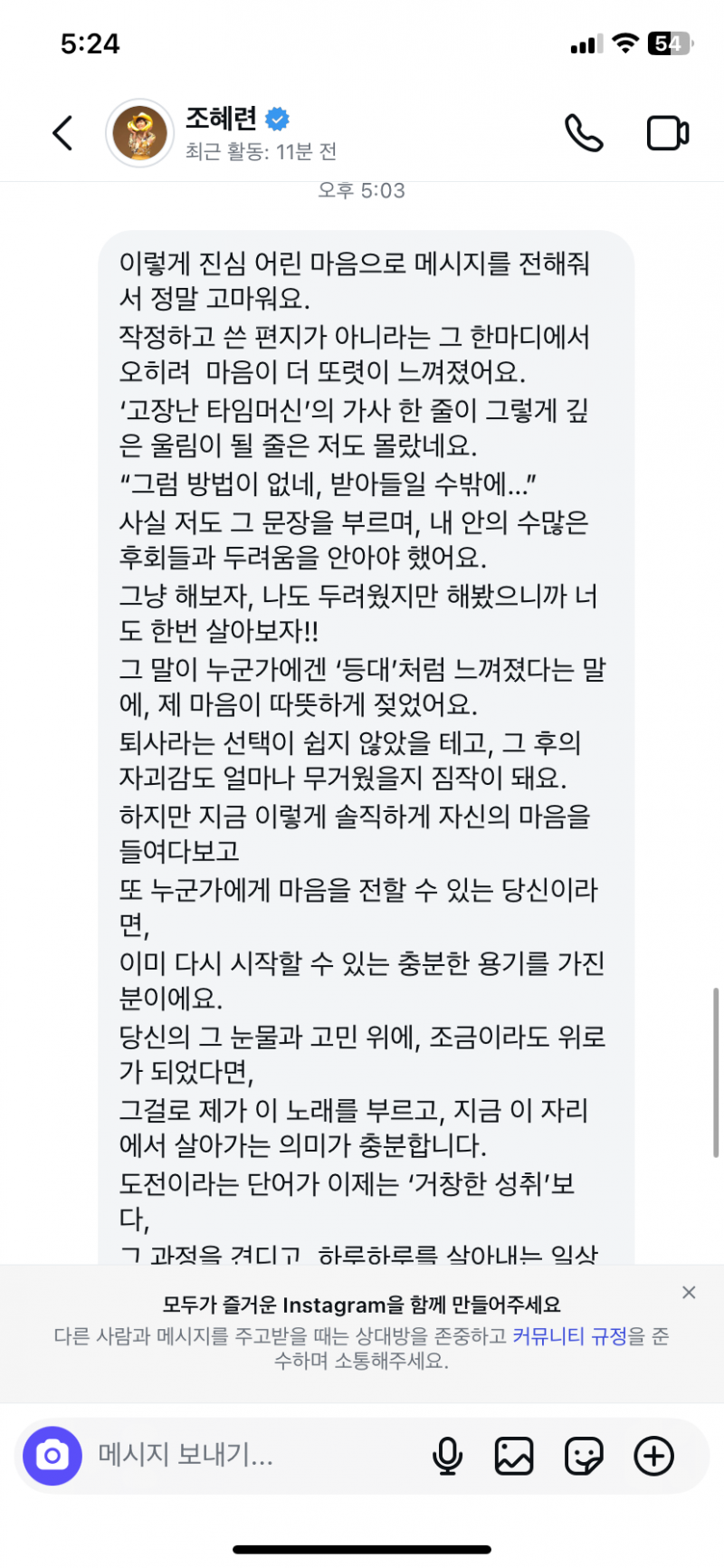 [스크랩] [흥미돋]현재 난리 난 조혜련 디엠 답장.JPG 작성자natural|작성시간25.10.28|조회수81,183 목록 댓글 55 글자크기 작게가 글자크기 크게가 출처: 여성시대 원글 출처:https://m.cafe.daum.net/subdued20club/Lp0T/169157000비상🚨🚨 다음검색 스크랩 원문 : *여성시대* 차분한 20대들의 알흠다운 공간 현재 게시글 추가 기능 열기 북마크 공유하기 신고 센터로 신고 댓글 댓글 55 댓글쓰기 답글쓰기 댓글 리스트 작성자잉싱이 | 작성시간 25.10.28 와 줄줄우는중 ㅠㅠ하.. 작성자apdnei | 작성시간 25.10.28 넘감동.. 작성자명신아감옥가자 | 작성시간 25.10.28 조혜련님 졸라멋있어요ㅠㅠㅠ 작성자나애대통령이재매이 | 작성시간 25.10.28 눈물쓰,,🥲 작성자큐티뽀짝말랑강쥐 | 작성시간 25.10.29 눈물줄줄.... 댓글 전체보기