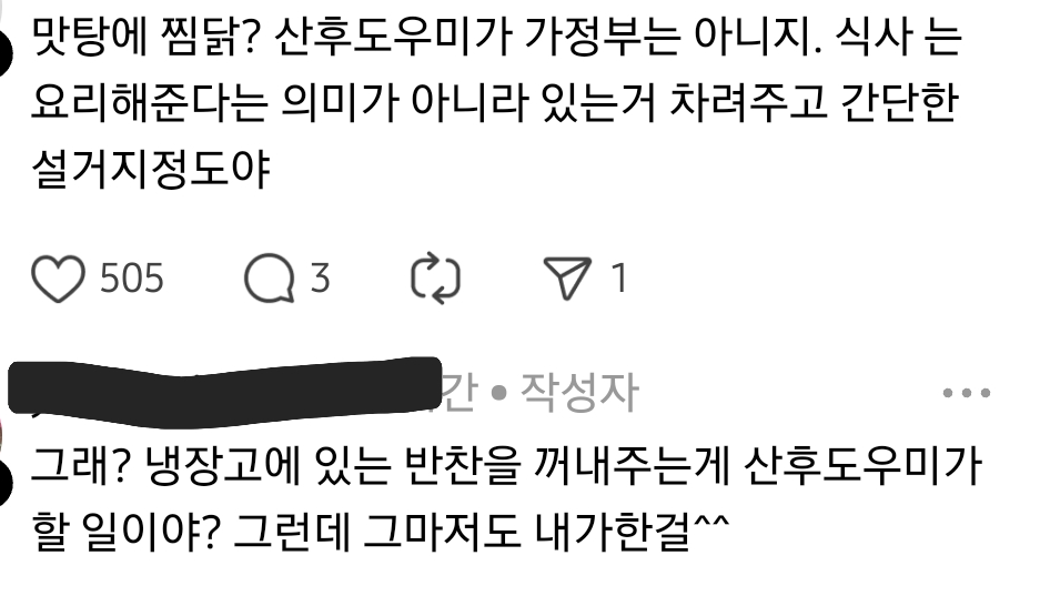 작성자한국남자 작성시간 25.10.30 정부지원 끝나고 나면 애보면서 간단한 맛탕 찜닭은 남편 해줄거지? 집안일도 하면서? ㅎㅎ
