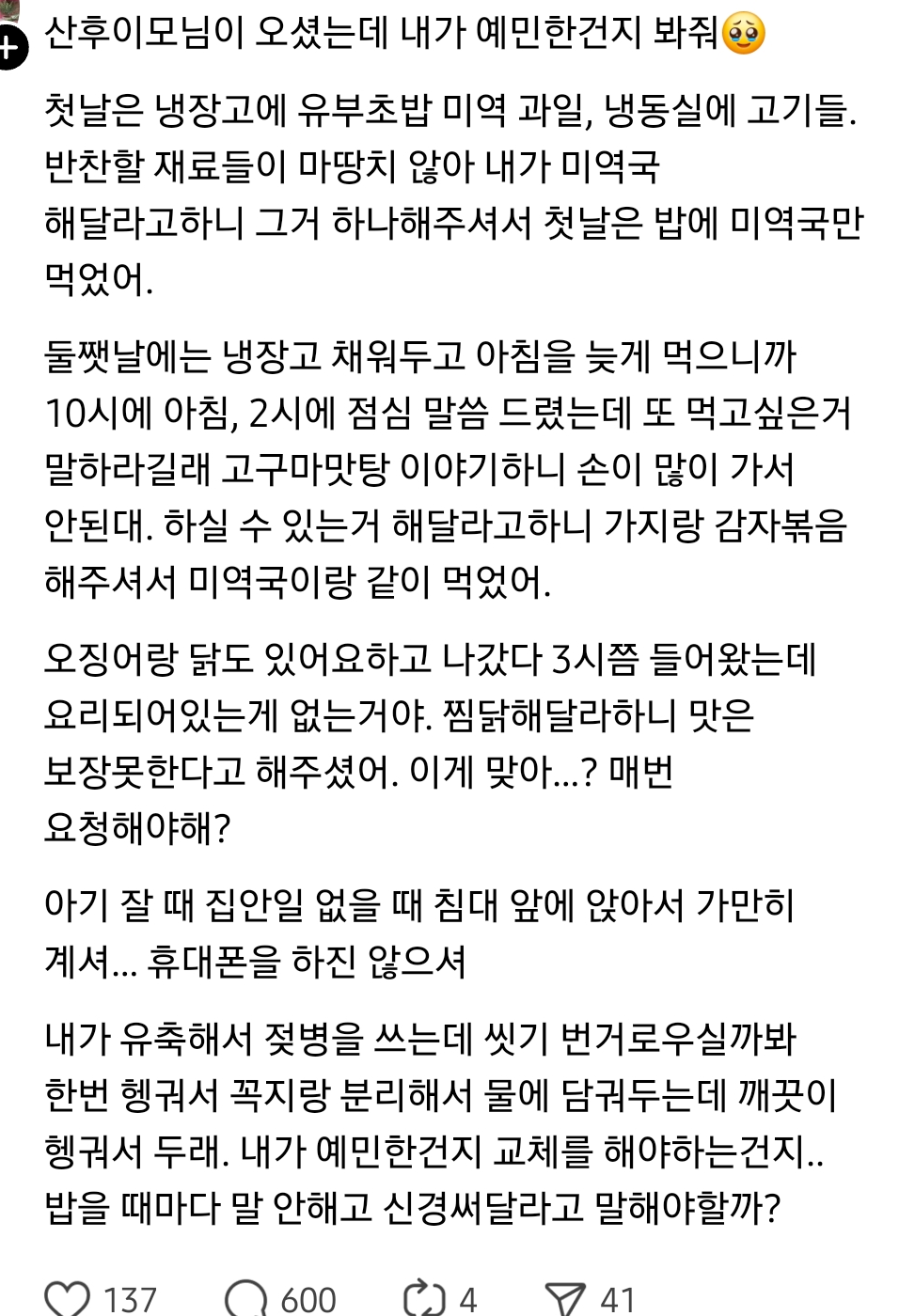 작성자솔솔의눈 작성시간 25.10.29 지 남편한테 해달라하면 되자너 애도 남이 낳아줘 하루종일 애 케어도 해줘 저정돈 유튭으로 배워서라도 해주겟지 양심잇으면